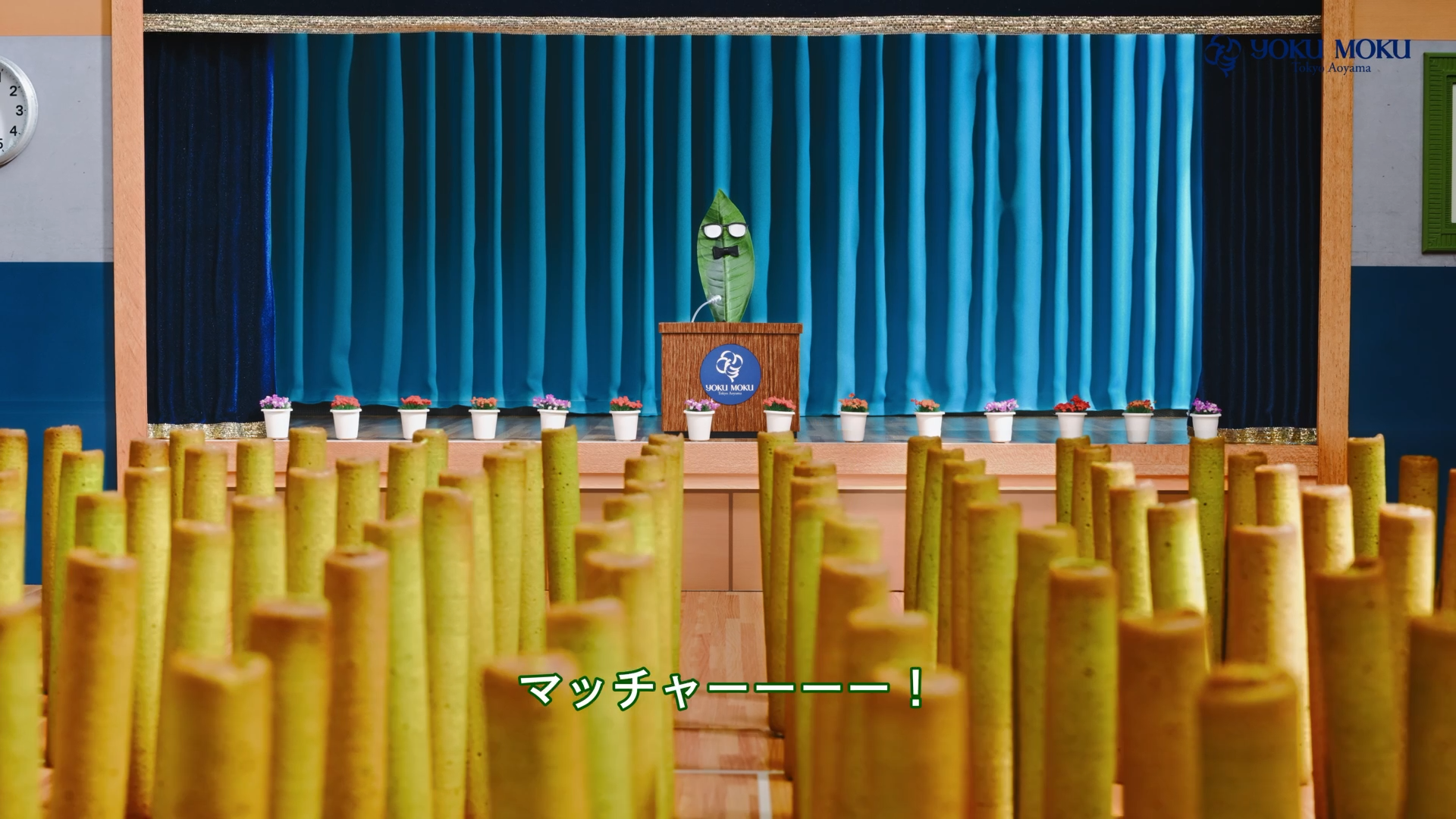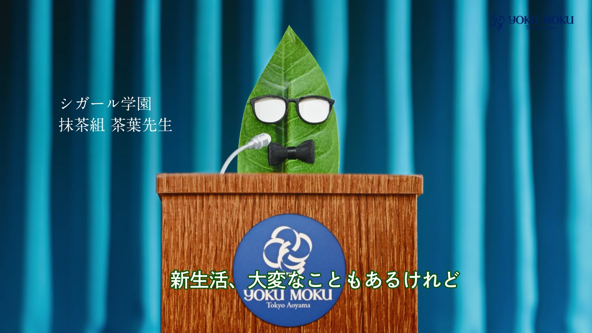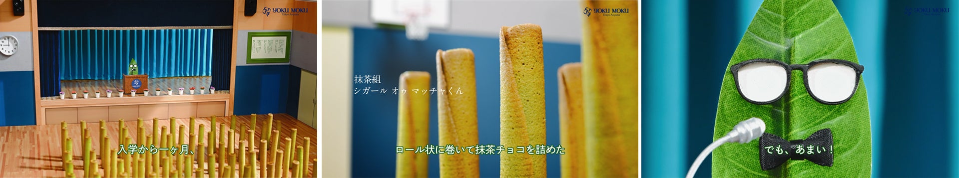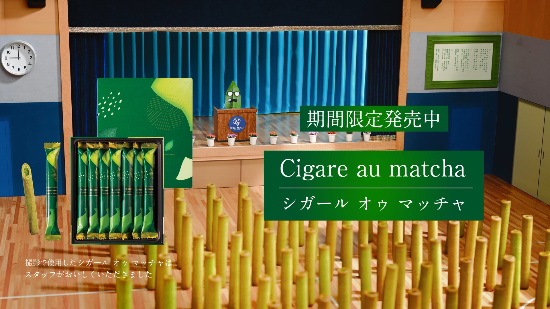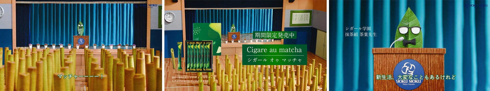 朝の心地よい光が差し込む体育館に、期間限定の販売期間も折り返しを迎えた生徒役の「シガール オゥ マッチャ」が、担任の「茶葉先生」に呼び出されて綺麗に整列しています。「シガール オゥ マッチャ」の担任である、抹茶の茶葉をイメージした「茶葉先生」がステージに登場すると、残りわずかの販売期間を一層盛り上げるため、生徒たちに向けて激励の言葉を投げかけます。蔵出し宇治抹茶を使用した「シガール オゥ マッチャ」の奥深い味わいや、ヨックモックの定番商品である「シガール」のようにお客さまに愛されたいという切実な気持ちを表現しました。「シガール オゥ マッチャ」を通してヨックモックブランドの新しい表現を感じていただける映像となっています。