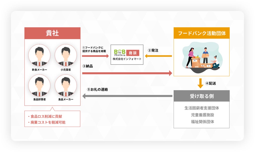 そこで、当社は、メーカーや食品卸、外食・小売企業等、余剰在庫等で食品廃棄の課題を抱える事業者と、フードバンク活動団体を「BtoBプラットフォーム 商談」上でつなぎ、双方の事業課題を解決するための新しいコーナーをオープンしました。