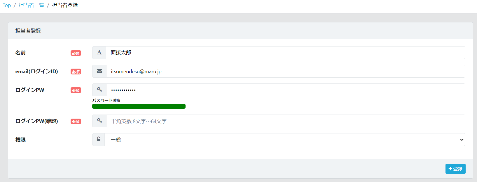 担当者アカウントを発行する際に設定するパスワードのセキュリティ強度を視覚的に確認出来る機能です。