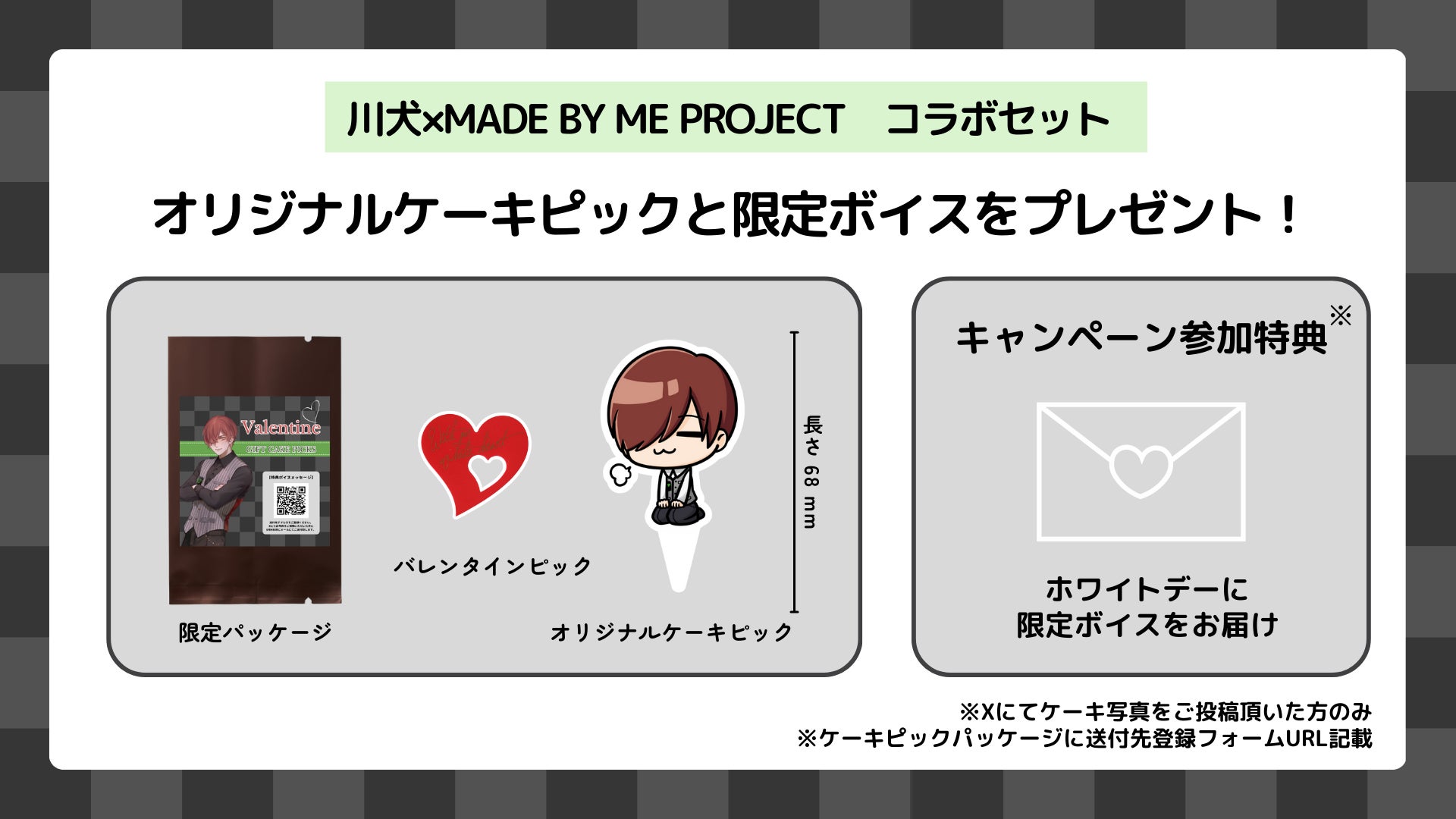 また2月22日(火)20時から、川犬さんによるバレンタイン特別配信を行います。さらに配信と連動し、手作りのバレンタインケーキの投稿を募集するX投稿キャンペーンを実施します。投稿された作品は川犬さんのバレンタイン特別配信で紹介され、「推し」への想いをカタチにした推し活体験を配信を通じて分かち合います。なお、キャンペーン参加者には、ホワイトデーにお返しとして「川犬さんボイスメッセージ」をプレゼントします。