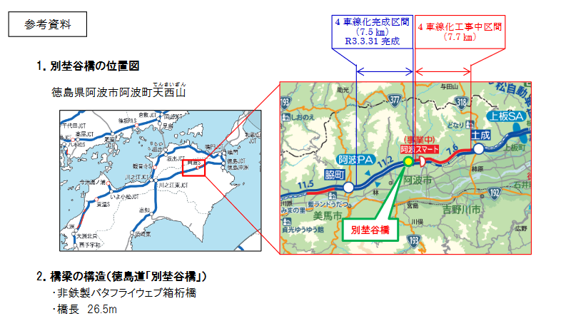 超高耐久橋梁「Dura‐Bridge®」は、E32 徳島自動車道(徳島道) 土成(どなり)インターチェンジ(IC)~脇町(わきまち)IC間)の「別埜谷橋(べっそだにばし)」において採用・施工されました。そして、「別埜谷橋」を含む7.5㎞の区間において、令和3年3月31日に4車線化が完成し、現在供用中です。