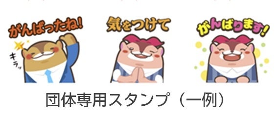 所属する組織全体で利用する『団体全体向け』と所属部署やチーム内で利用する『グループ内』の2つのチャットに、メッセージやスタンプ、リアクションを送信できます。また、各ユーザーがイベントなどで入手した基本スタンプのほか、本機能契約の団体ユーザーが共通で使用できる「団体専用スタンプ」も送れます。