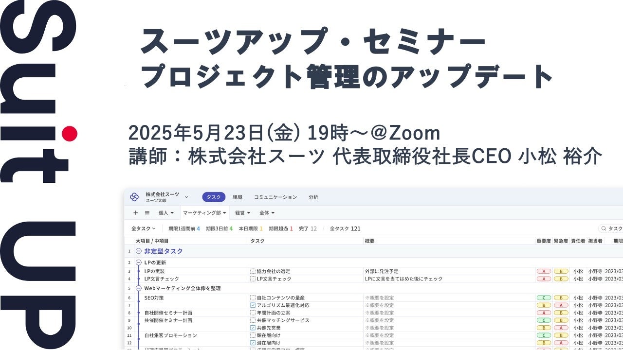 株式会社スーツ(所在地:東京都千代田区、代表取締役社長CEO:小松 裕介)は、2025年5月23日(金)19時から、当社代表の小松が講師を務めるスーツアップ・セミナー「プロジェクト管理のアップデート」を無料開催します。