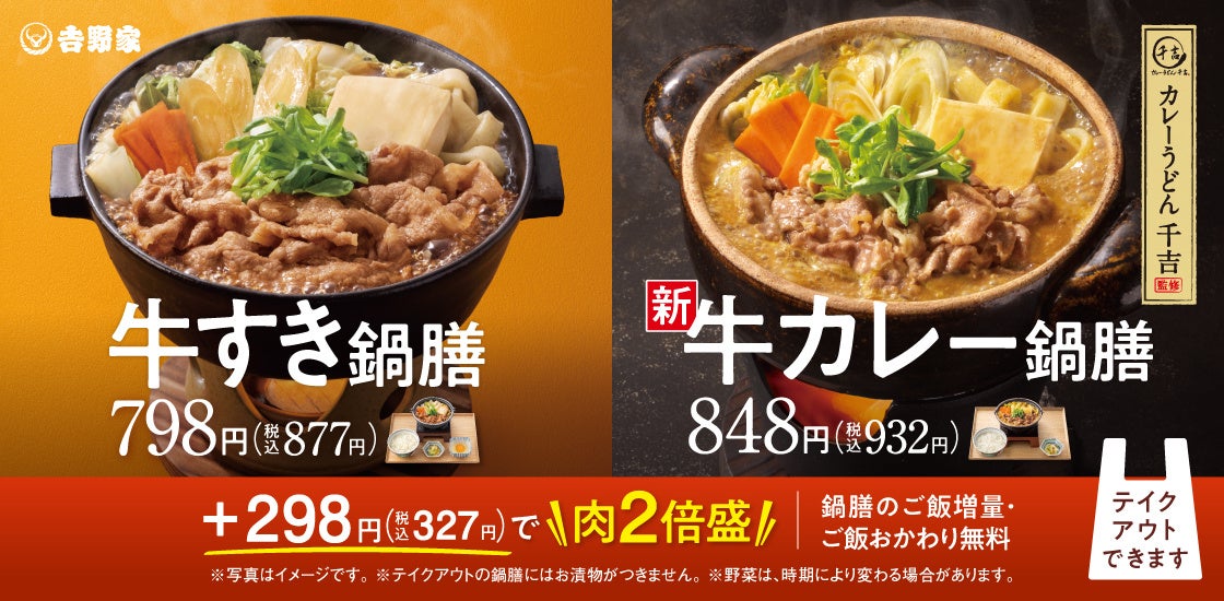 株式会社吉野家(本社:東京都中央区、代表取締役社長:河村泰貴)は、全国の吉野家店舗で本日より、累計1億食の販売数を突破した季節商品人気No.1の「牛すき鍋膳」本体価格798円(税込877円)と、新商品「牛カレー鍋膳」本体価格848円(税込932円)を販売します。