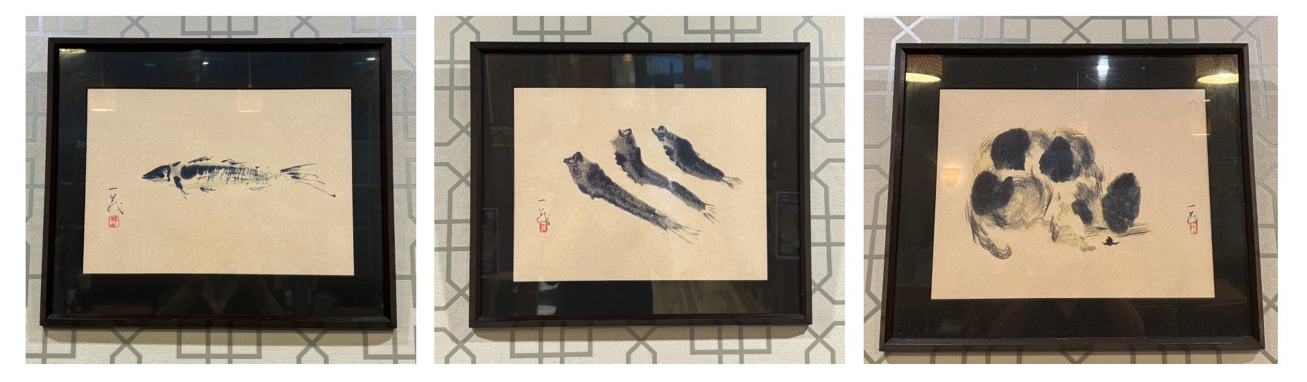 魚や猫が描かれた絵にはご本人のお名前と落款が入っています。千吉 表参道店に飾っているのは原画を印刷したものになります。