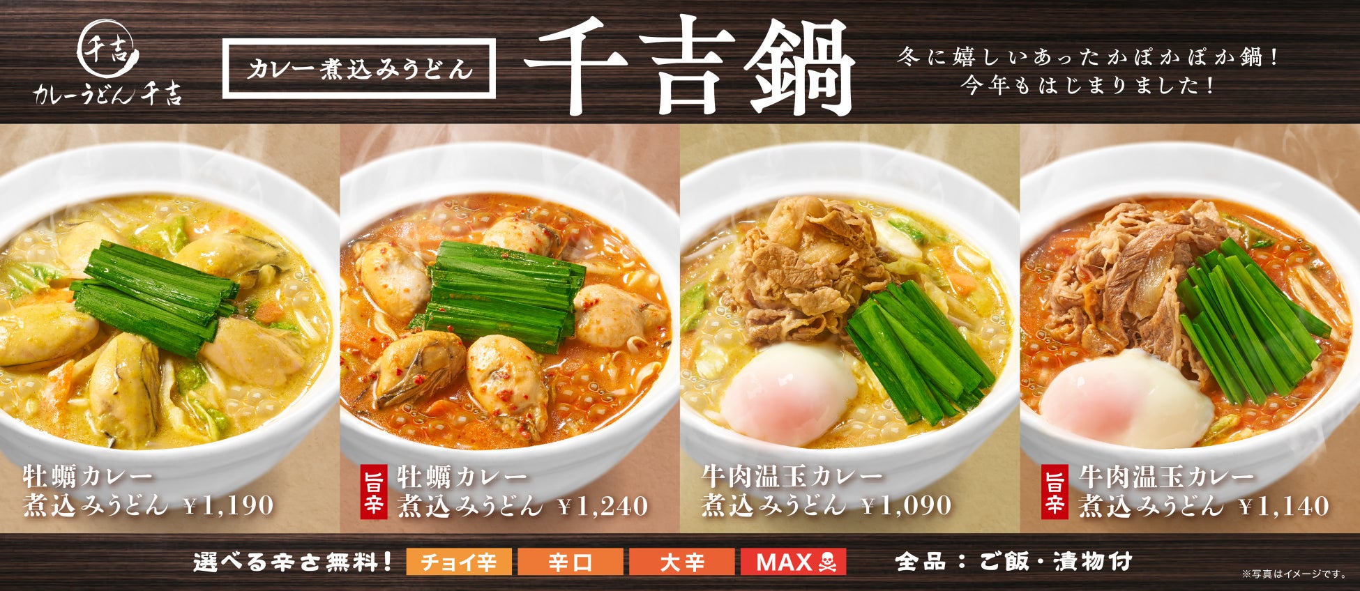 カレーうどん専門店 千吉では、本日より全店舗(※3)でカレー煮込みうどん鍋「千吉鍋」を販売します。土鍋にたっぷりの千吉特製カレースープと牡蠣や牛肉、野菜などの食材、そして千吉オリジナルの平打ち麺を入れてグツグツと煮込みました。熱々の土鍋のまま提供するため、食材の旨味を逃さず、最後まで熱々のままお召し上がりいただけます。「千吉鍋」には「千吉カレーうどん」同様に、ご飯・漬物が付きます。鍋を食べ進めた段階でスープにご飯を入れてカレー雑炊にする食べ方もおすすめです。「千吉鍋」は、「牡蠣カレー煮込みうどん」税込1,190円、辛味を追加した「旨辛牡蠣カレー煮込みうどん」税込1,240円、「牛肉温玉カレー煮込みうどん」税込1,090円、「旨辛牛肉温玉カレー煮込みうどん」税込1,140円の4種類です。