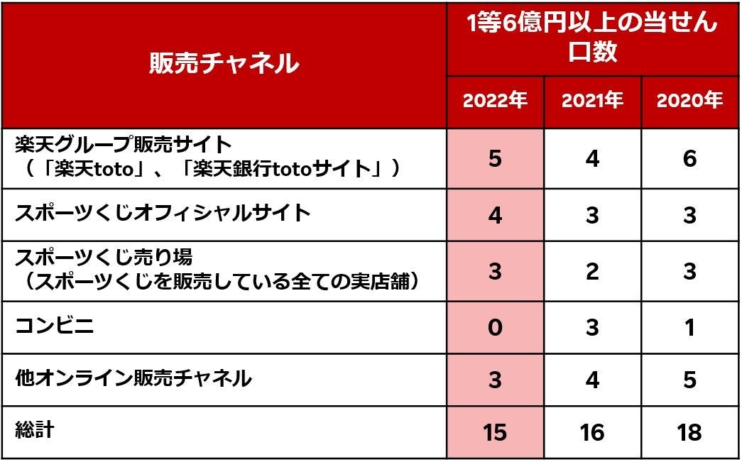 (注1)「BIG」の1等当せん金は最高3億円で、キャリーオーバー発生時には最高6億円となります。当せん金は、売上金額や当せん口数によって変動します。本発表は、スポーツくじオフィシャルサイトの情報に基づき、特別開催回を含む6億円以上となった1等当せん口数を楽天が集計したもので比較しています。なお、2022年の当せん口数は第1275回(販売期間2021年12月28日~2022年1月1日)から第1342回(販売期間2022年12月26日~12月29日)までが対象です。