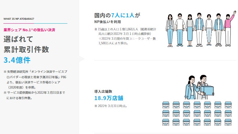 「NP後払い」は、BtoC取引のECを対象にしたBNPL決済サービスです。年間流通金額3,746億円、年間ユニークユーザー数(※1)は1,500万人超と「日本で7人に1人が使っている決済(※2)」にまで成長しました。購入者はクレジットカードの情報登録が不要、かつ商品受取り後にお支払いができることから、はじめて利用するECショップでも安心してお買い物を楽しむことができます。また事業者はネットショッピングにおける約20%の後払いニーズ(※3)を、未回収リスクなく提供できることで売上の向上が期待できます。