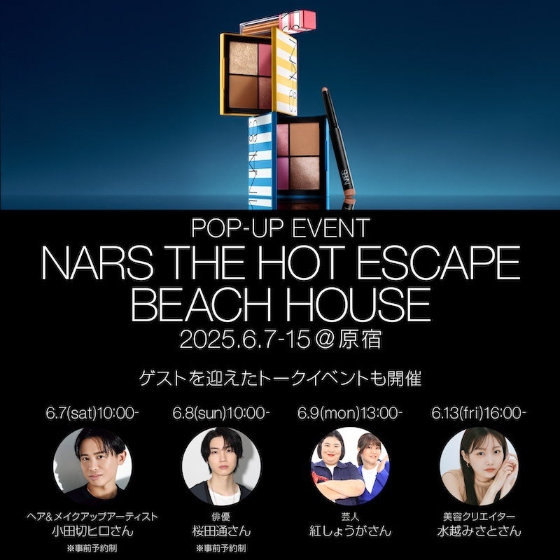 NY発のメイクアップアーティストブランド「NARS」は、2025年6月7日(土)~6月15日(日) の9日間、東京・原宿にて、ブランド初となる大型ポップアップイベント「NARS THE HOT ESCAPE BEACH HOUSE 」を開催いたします。