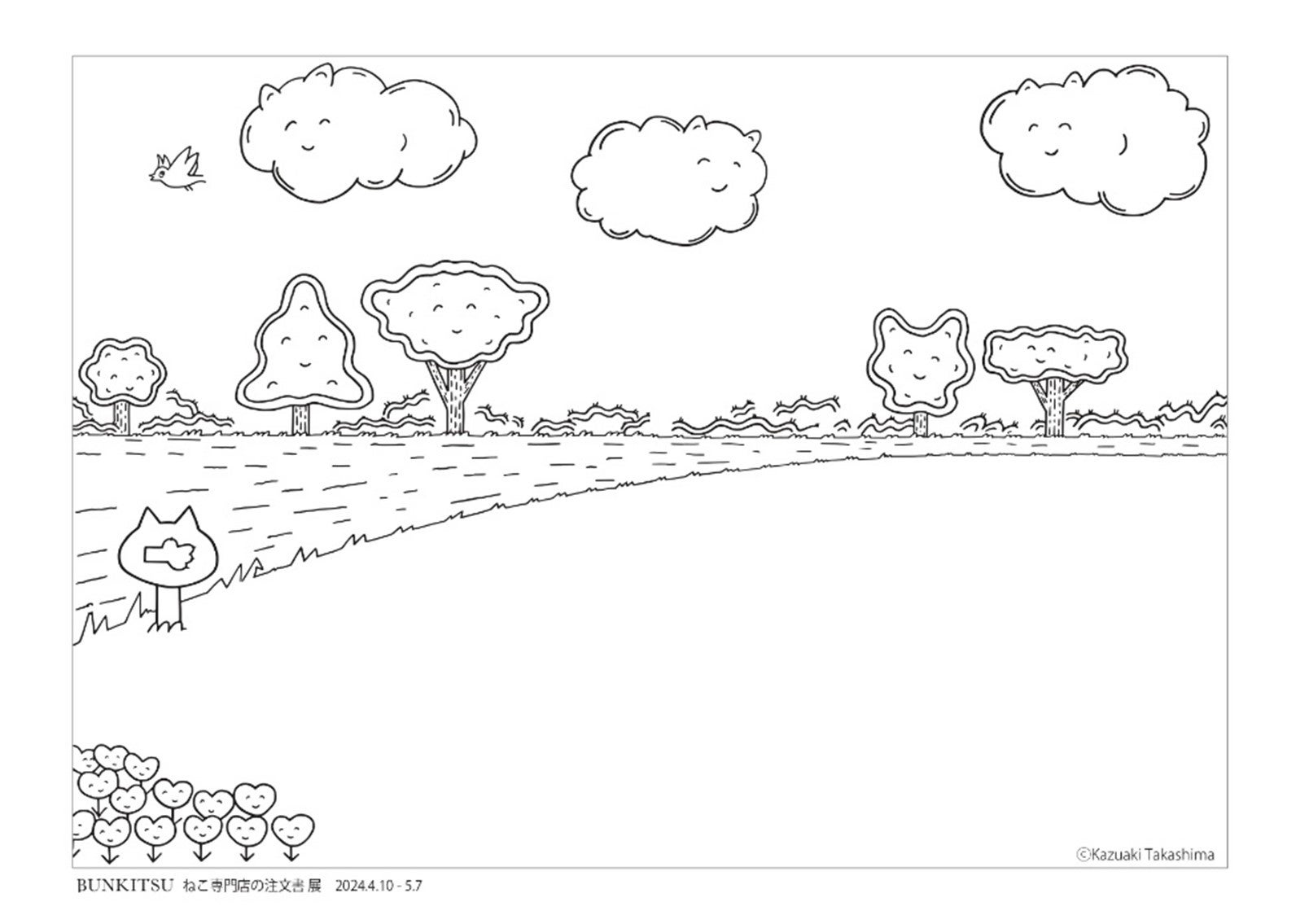 「ねこ専門店の注文書展」では、新作となる本書およびキャラクターの原画展示やグッズ販売を行うほか、絵本の中に登場する「ねこ専門店」へと続く道を来場者で作る参加型の展示も行います。また、有料エリアへの入場特典として有料エリア内にある「ねこ専門店」キャラクターのオリジナルスタンプを押して完成させる塗り絵をプレゼントします。