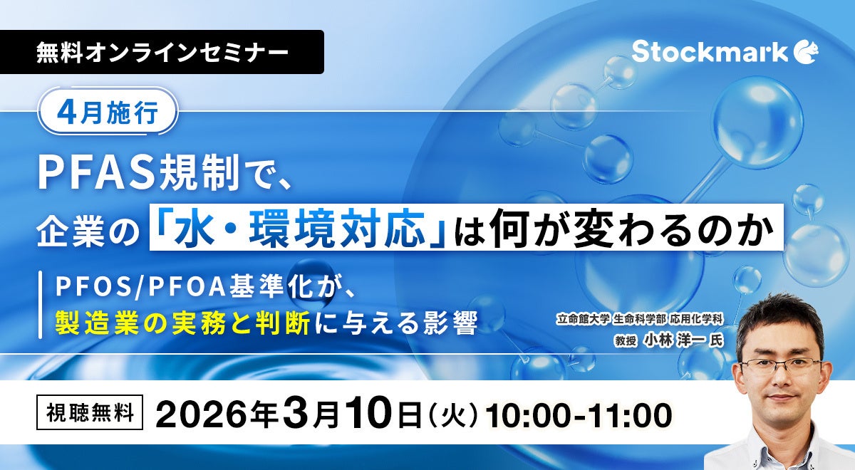 ストックマーク株式会社は、オンラインセミナー『4月施行|PFAS規制で、企業の「水・環境対応」は何が変わるのか ― PFOS/PFOA基準化が、製造業の実務と判断に与える影響』を開催致します。