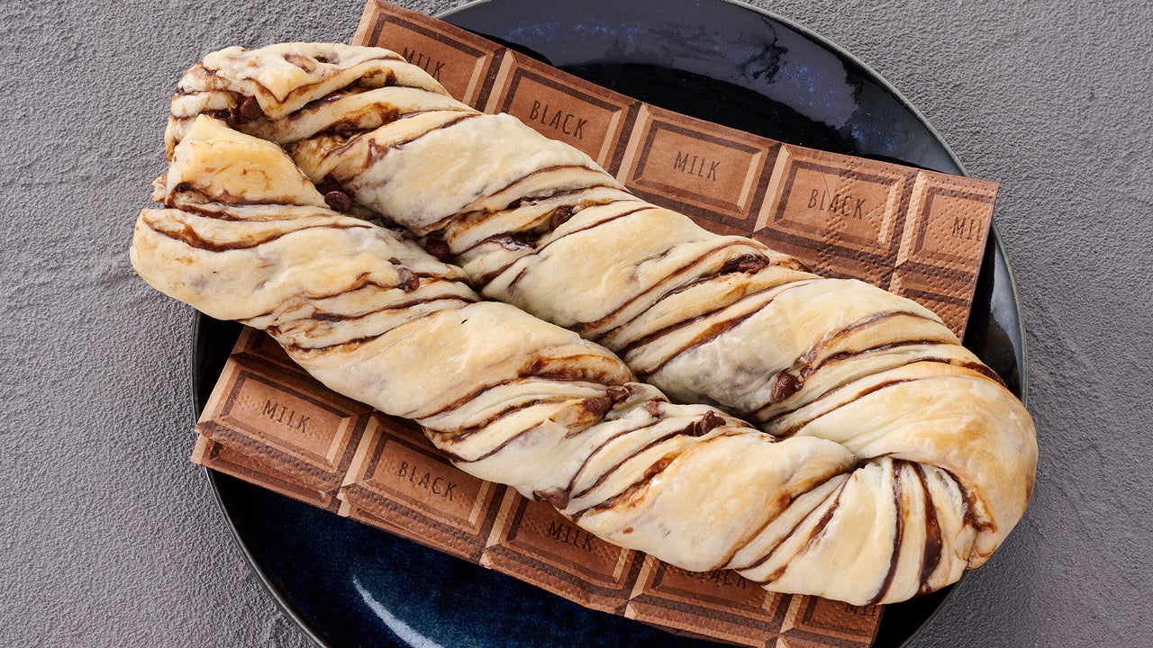 ベルギーチョコ入りのチョコペーストを折り込み、更にチョコチップを混ぜて焼き上げたもちもち食感のツイストパンです。