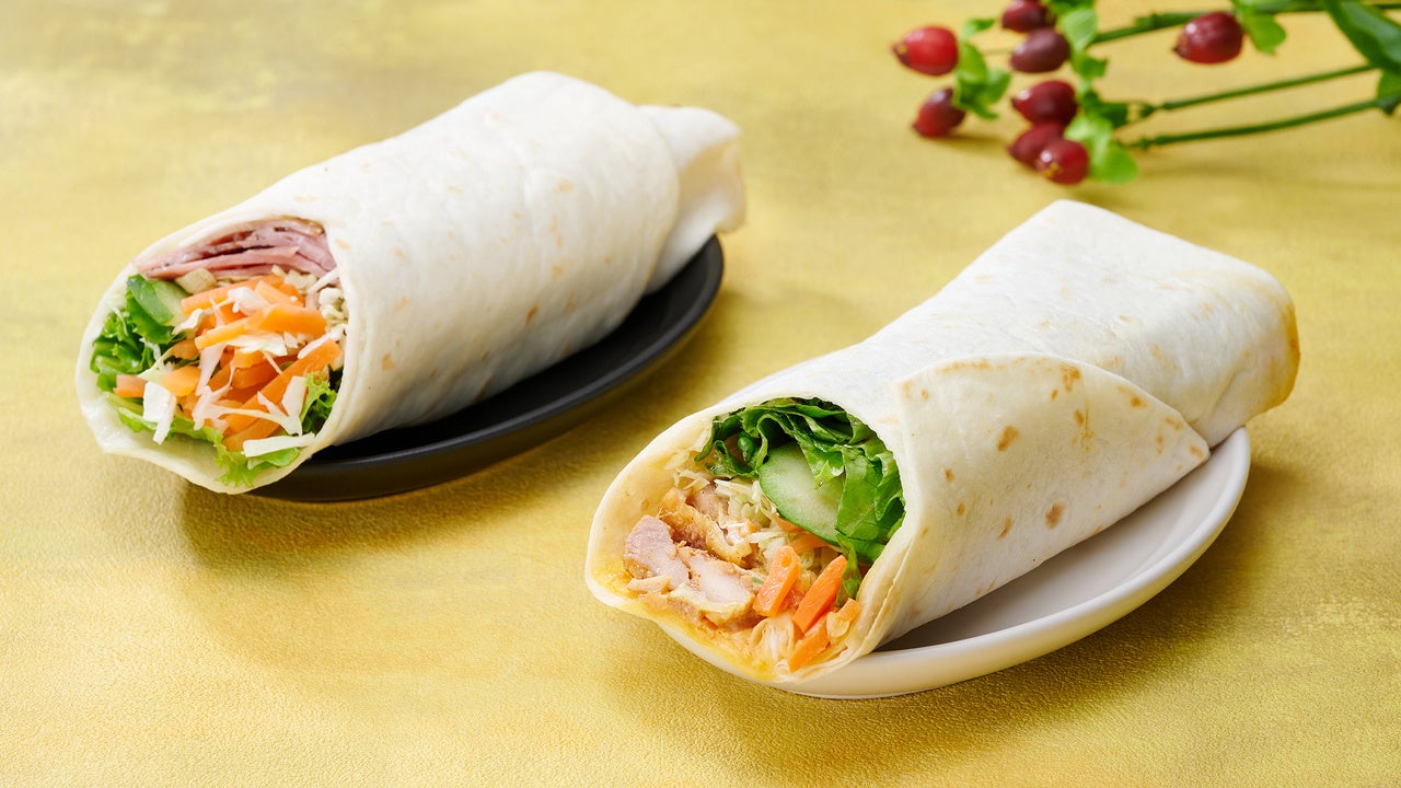 (左) パストラミポークと野菜をシーザーサラダソースで味わいよく仕上げました。