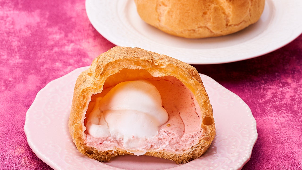 あまおう苺果汁入りのいちごクリームとミルク風味のホイップクリームの2種のクリームを使ったツインシューです。