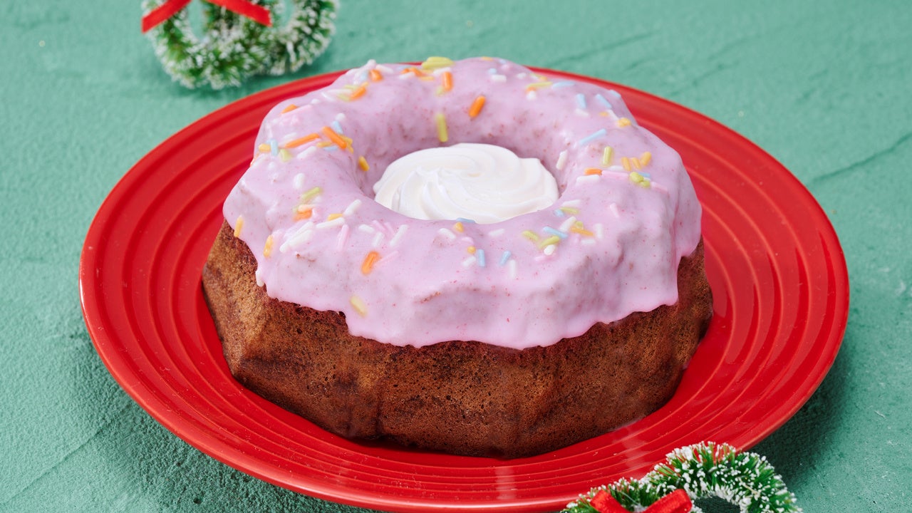 チョコ風味のスポンジケーキに、いちごチョコとカラースプレー、練乳入りホイップクリームで飾ったクグロフです。