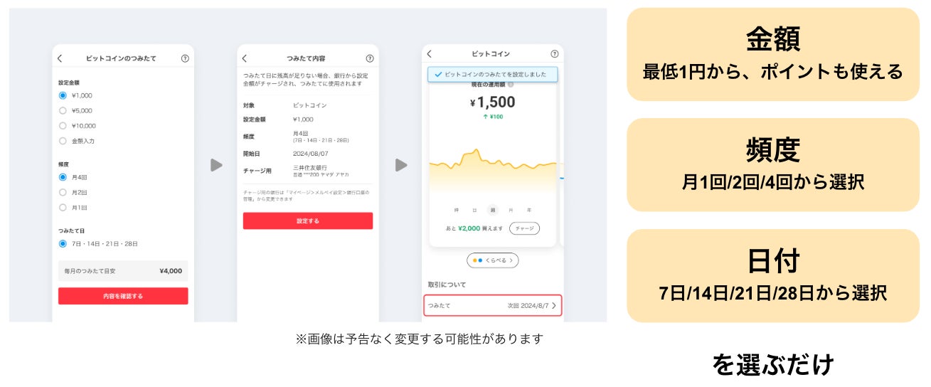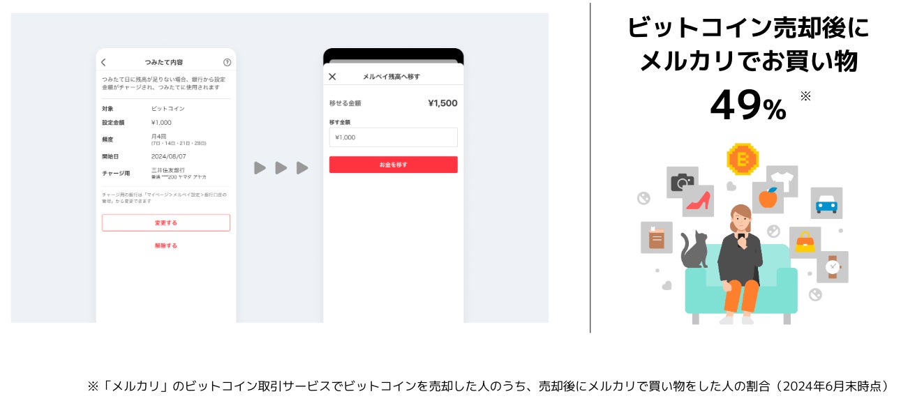 株式会社メルカリ(以下、メルカリ)の子会社で、暗号資産やブロックチェーンに関するサービスの企画・開発を行う株式会社メルコイン(以下、メルコイン)は、2024年8月1日より、メルカリアプリで簡単に設定でき、銀行からの自動引落しでビットコインをつみたてられる「ビットコインつみたて機能」の提供を開始(※1)いたします。