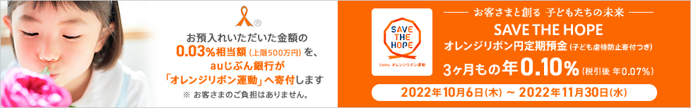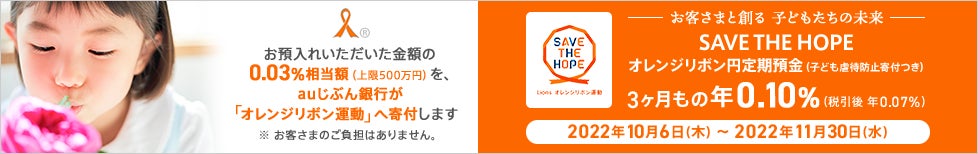 auじぶん銀行株式会社(本社:東京都中央区、代表取締役社長:石月 貴史、以下 auじぶん銀行)は、2022年10月6日から2022年11月30日まで、「SAVE THE HOPE オレンジリボン円定期預金(子ども虐待防止寄付つき)キャンペーン」(以下 本キャンペーン)を実施します。