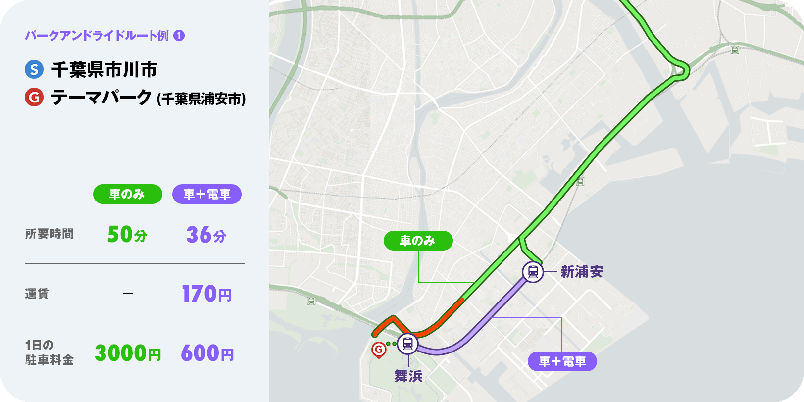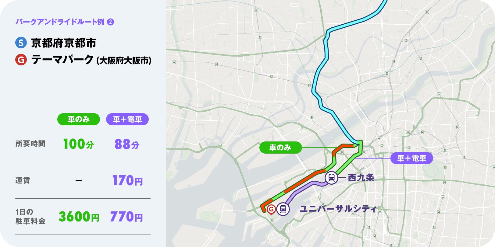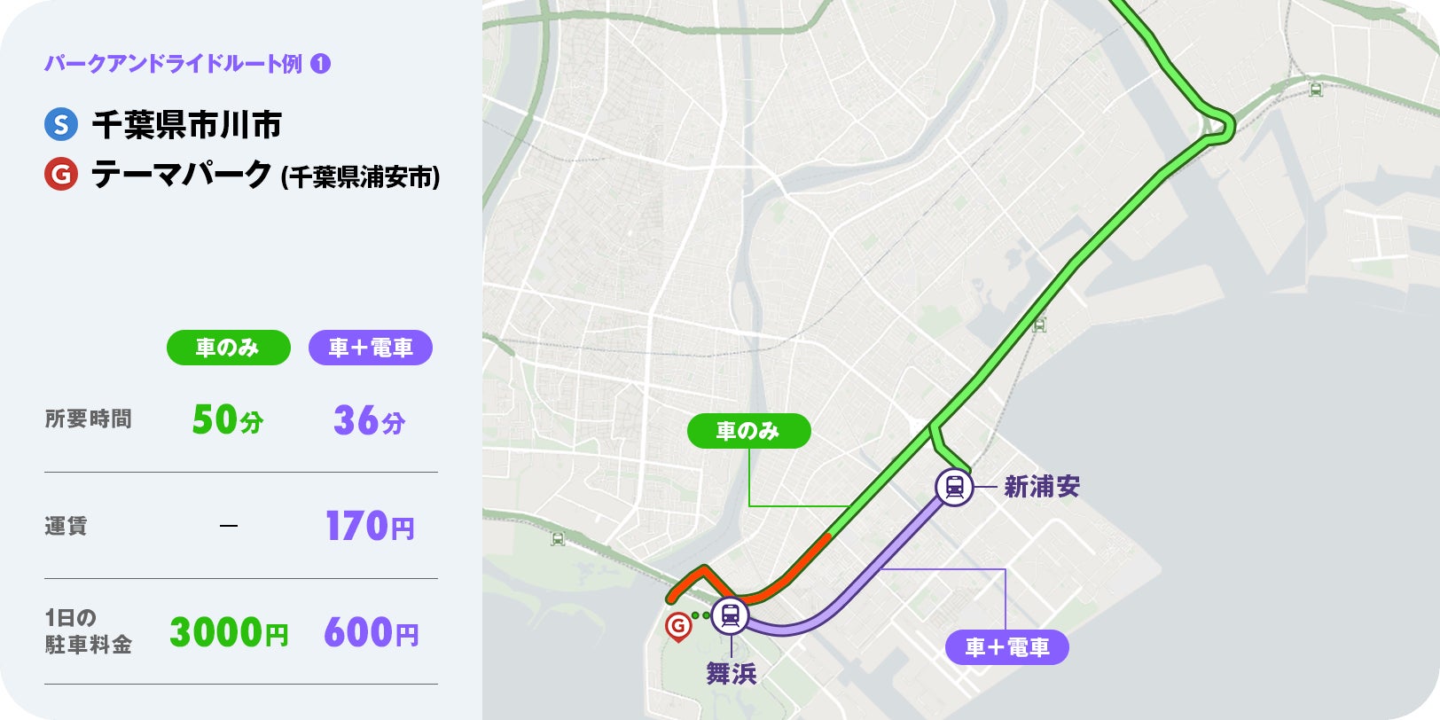 レジャー施設や観光スポット、イベントホール、大型商業施設などレジャー時期に多くの人が集まるスポットを目的地としたルート検索時に、目的地周辺の道路渋滞を予測し、通常のルート検索結果に加えて最大3つの「パークアンドライドルート」を提案します。所要時間や電車代・乗車駅周辺の駐車場料金相場などを比較しながら、ルートを選べます。