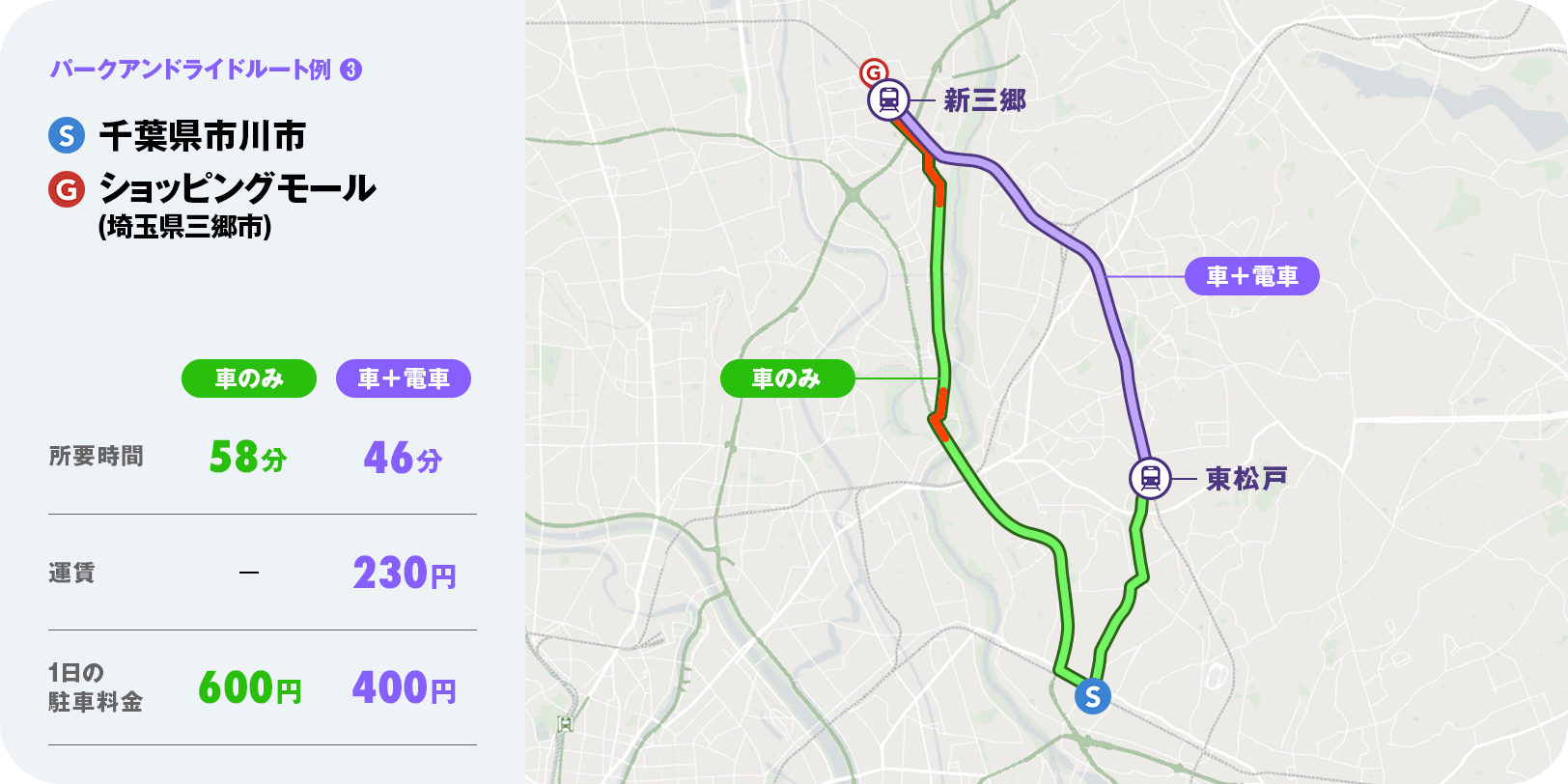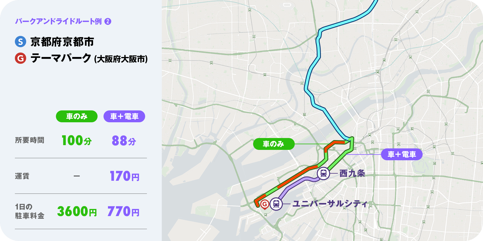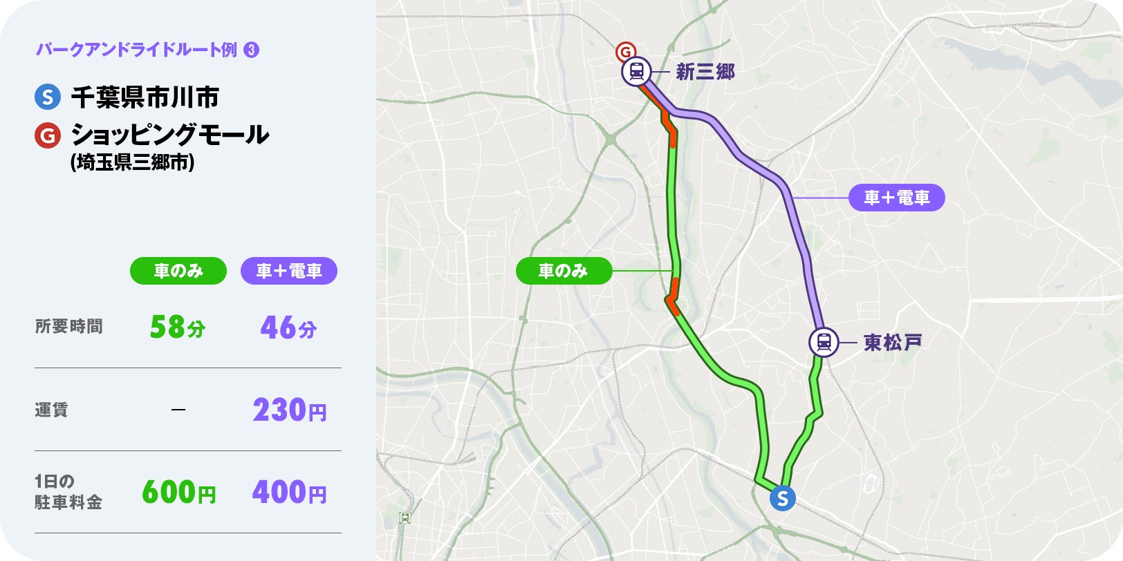 レジャー施設や観光スポット、イベントホール、大型商業施設などレジャー時期に多くの人が集まるスポットを目的地としたルート検索時に、目的地周辺の道路渋滞を予測し、通常のルート検索結果に加えて最大3つの「パークアンドライドルート」を提案します。所要時間や電車代・乗車駅周辺の駐車場料金相場などを比較しながら、ルートを選べます。