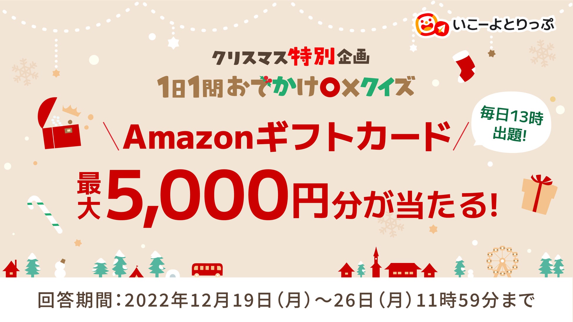 2022年12月19日(月)から26日(月)11時59分まで、最大5,000円分の「Amazonギフトカード」が当たるクリスマス特別企画「1日1問おでかけ〇×クイズプレゼントキャンペーン」(以下、〇×クイズ)を開催。おでかけスポットにまつわる「ちょっとだけマニアックな情報」を、〇×クイズ形式で1日1問・全5問出題します。参加回数と正解数が多いほど当選確率がアップします。