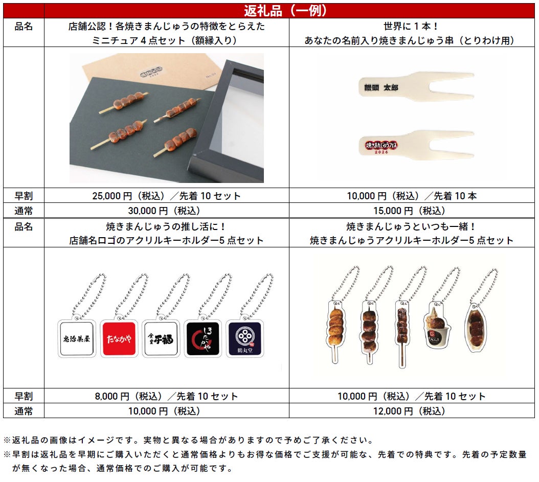 さらに、地域の持つ価値を大切に守り育てていく一員として多くの方々に携わっていただき、みんなで楽しめる場所を創りたいという考えから、クラウドファンディングを実施いたします。焼きまんじゅう屋での焼き師体験など、イベントの枠を超え地域の文化に触れ楽しめる、焼きまんじゅう尽くしの返礼品をご用意しています。
