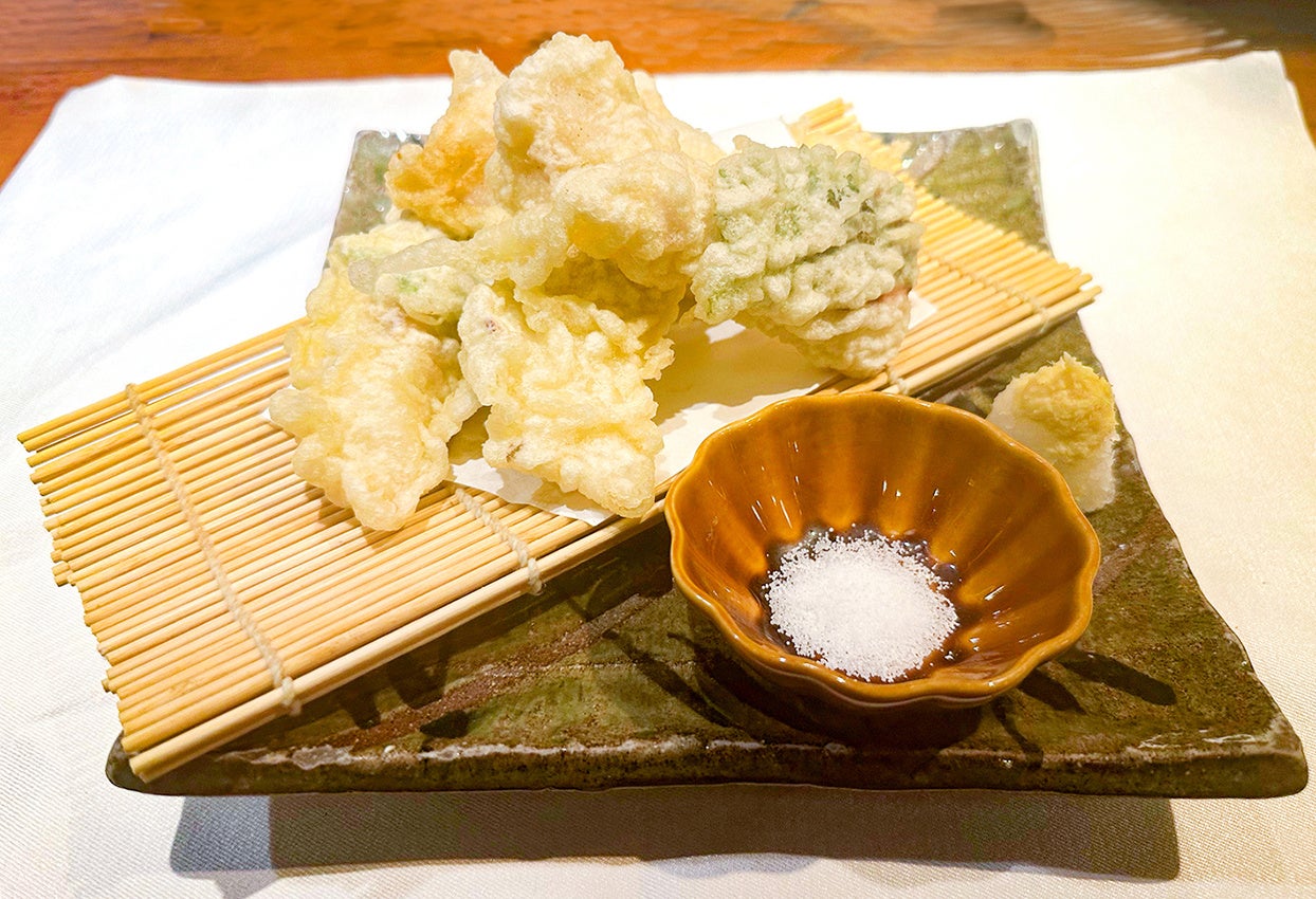 白身魚に梅肉と大葉を合わせて揚げました。夏こそ際立つ、梅肉