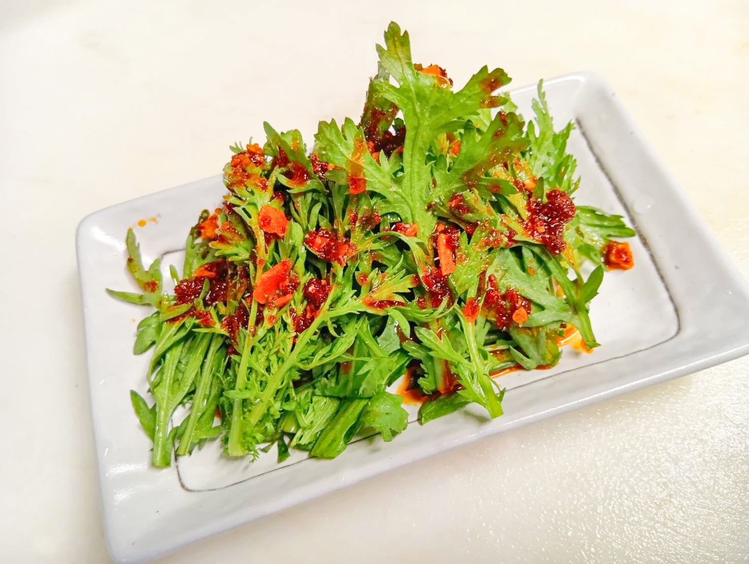 シャキシャキした食感の春菊サラダを食べるラー油で混ぜ合わせ