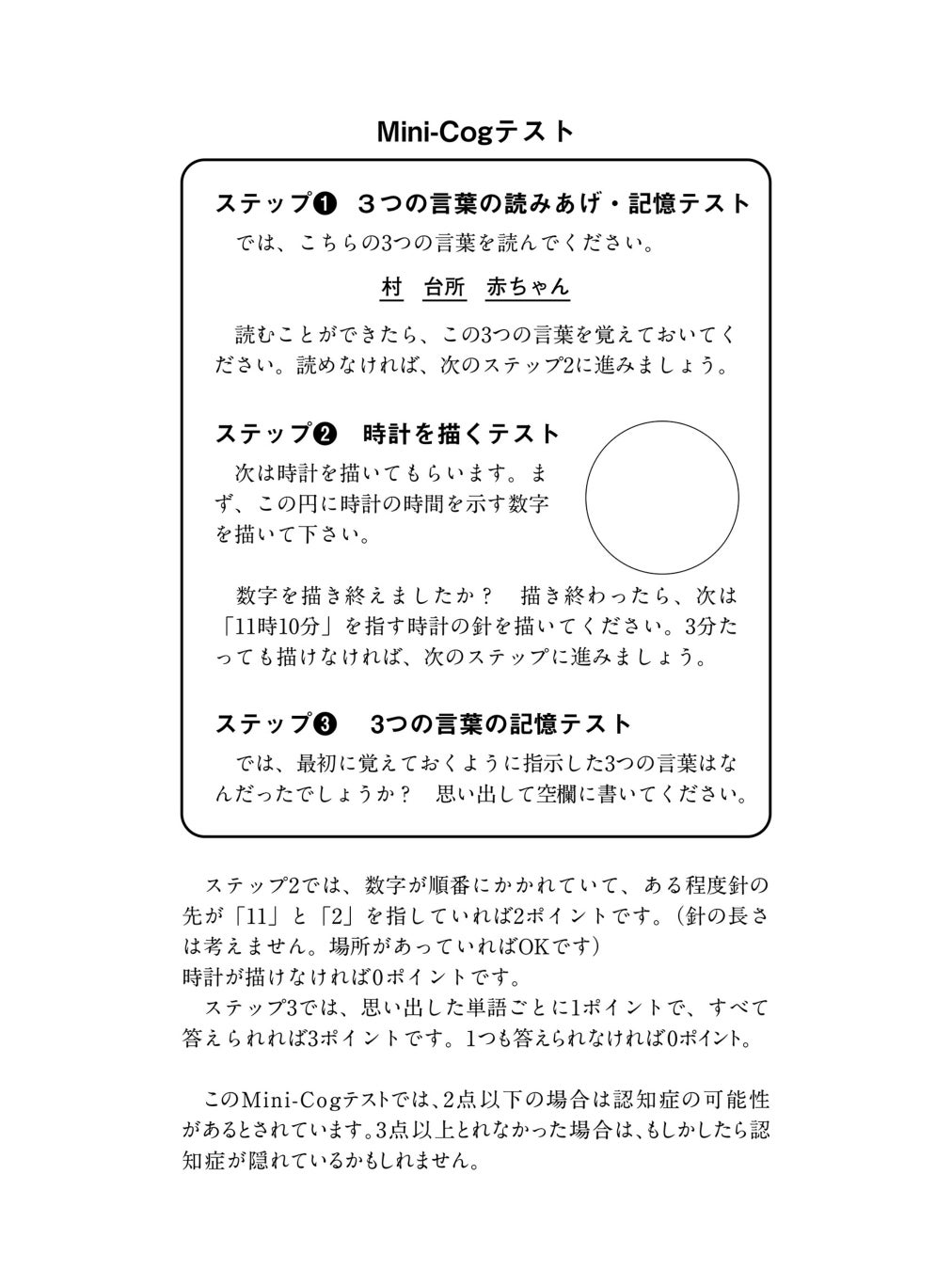 認知症の発見、といっても、その違和感は日常生活のほんの一片。見逃しやすい分、家族や周りの人などが、その違和感をかかりつけの医師に伝えることが非常に重要です。本書では、絶対に見逃してほしくない認知症のサインをお伝えします。また、医療現場でも実際に標準的に使用されている、信頼のおける認知症の3分ふるい分けテストも紹介します。
