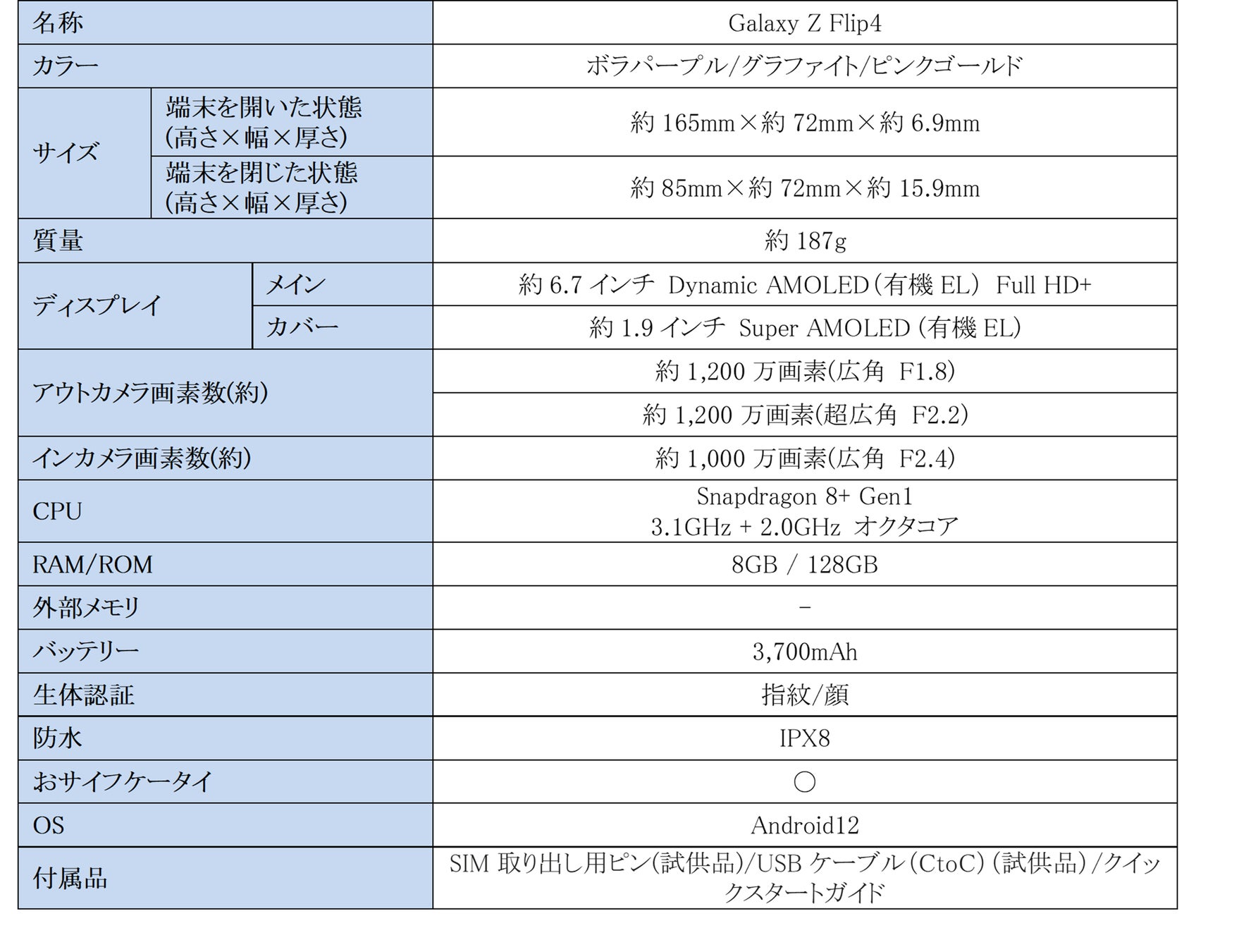 「Galaxy Z Flip4」の特長は、以下のとおりです。