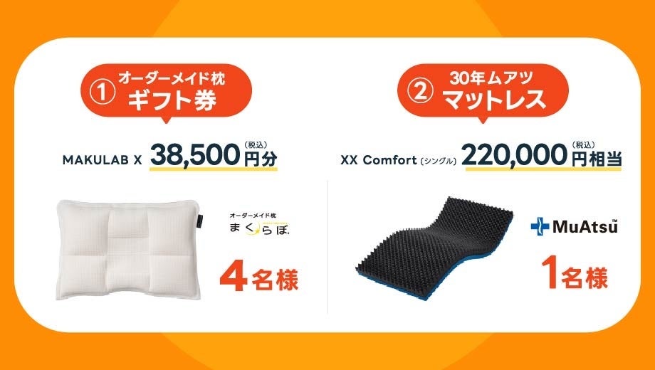 昭和西川の看板商品である「ムアツ」やオーダメイドまくらなど、5名様に当たるチャンス◎