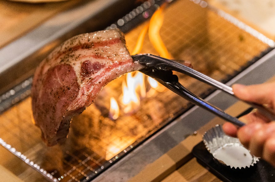 テーブルに設置された専用の炭火で⾁や野菜を豪快に焼き上げる 「バーベキュー」!キャンプギアを使って好きな素材を好きなように調理する 「キャンプめし」!水沼店は “ 地産地消 ” をテーマに、群馬県産の食材をふんだんにご用意してお待ちしております!