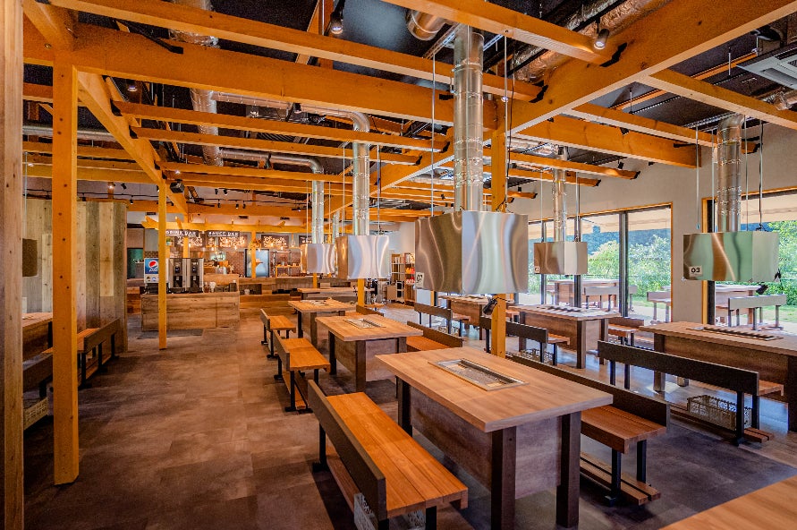 各テーブルも十分な広さで天井が高く解放感のある店内は、大容量の吸排気・空調を完備した衛生的な環境で、気温や天候を気にせず “炭火を使った本格的なバーベキュー” を存分に楽しめる。