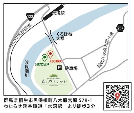 築地銀だこを国内外に展開する株式会社ホットランドの創業地でもある群馬県桐生市。中でも黒保根町水沼は、山と川に囲まれた絶好の里山ロケーション。わたらせ渓谷鐵道「水沼駅」から橋を渡り徒歩3分。自然豊かで近隣には様々な観光資源に恵まれている立地。今回の『SUMI TERRACE 森のヴィレッジ』計画は、この水沼エリアを “人が集まる新たなスポット” にすべく、飲食施設の他、新たなレジャー施設等の開業も視野に入れ、地域の活性化につながるよう進めております。