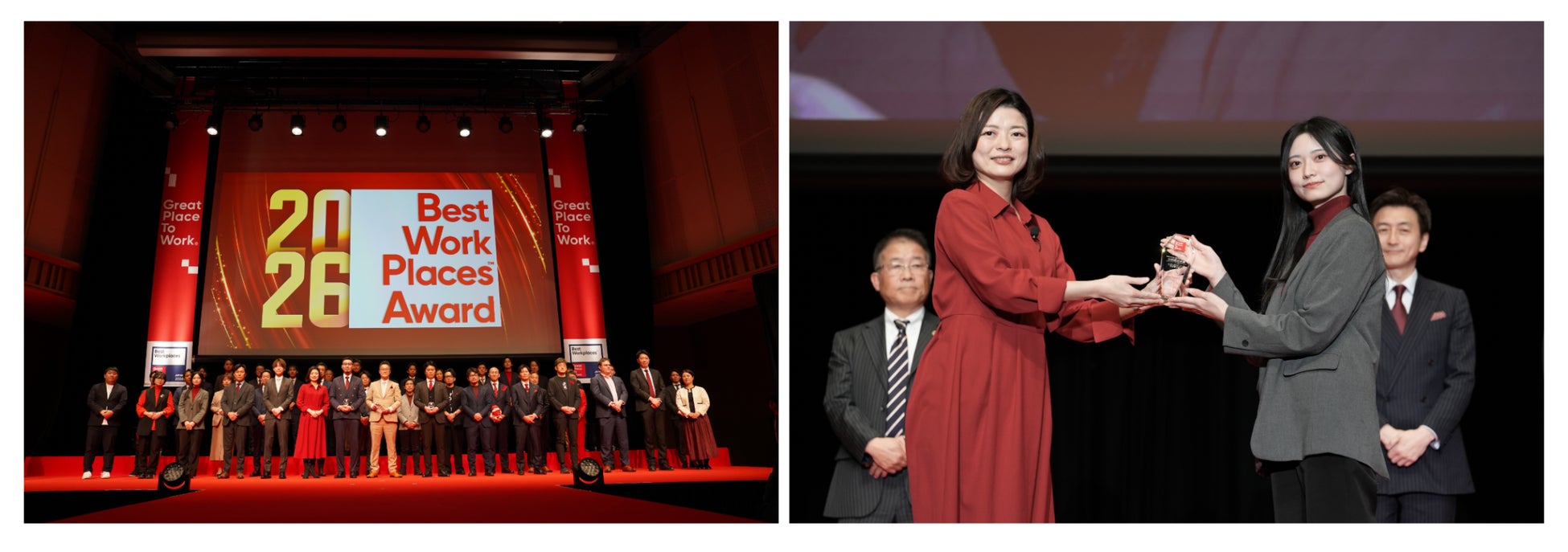 「2026年版 日本における働きがいのある会社」ランキングとは、従業員と企業双方へのアンケート結果を厳正に数値化し、一定の基準を満たした上位企業を選出するものです。当社は2022年の初選出以来、組織の拡大期においても立ち止まることなく、5年連続の受賞を達成。表彰式では、5回選出企業として登壇し、継続的な働きがいのある組織づくりへの取り組みに対し、記念盾が贈呈されました。