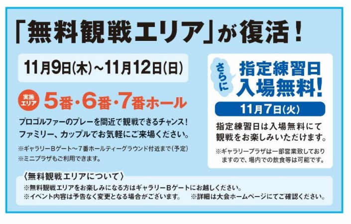 そして今年、新たな一歩となる第51回大会は、本年6月より三井住友カードがスポンサー契約を結んでいる昨年大会優勝者 石川遼選手を大会アンバサダーに迎え、様々な取り組みを通じて大会を盛り上げます。また、昨年に引き続き、より多くのゴルフファンに観戦していただけるよう「無料観戦エリア」を設定。ゴルフ観戦に興味がある方、お子様とご一緒の方などに、ゴルフ観戦を体験いただける機会を提供いたします。新たな歴史のはじまりである51回大会の優勝を懸けたトッププロの熱戦をぜひご期待ください。