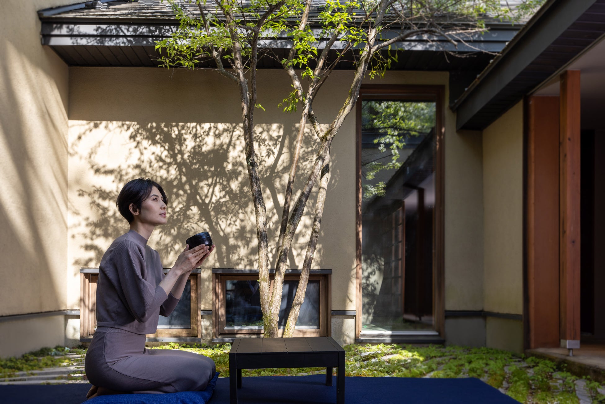 カウンター席での食事の前に、一棟貸し切りの建物内にある中庭で「芽吹きの一献」を提供します。芽吹きの一献は、白味噌を合わせた甘酒に、菜の花の摺り流しを加えた一椀です。発酵食材である甘酒を温めて提供することで、山菜を存分に味わえるよう胃を整えます。春の柔らかな日差しと野鳥のさえずりが心地よい空間で、身も心も落ち着くひとときを過ごせます。