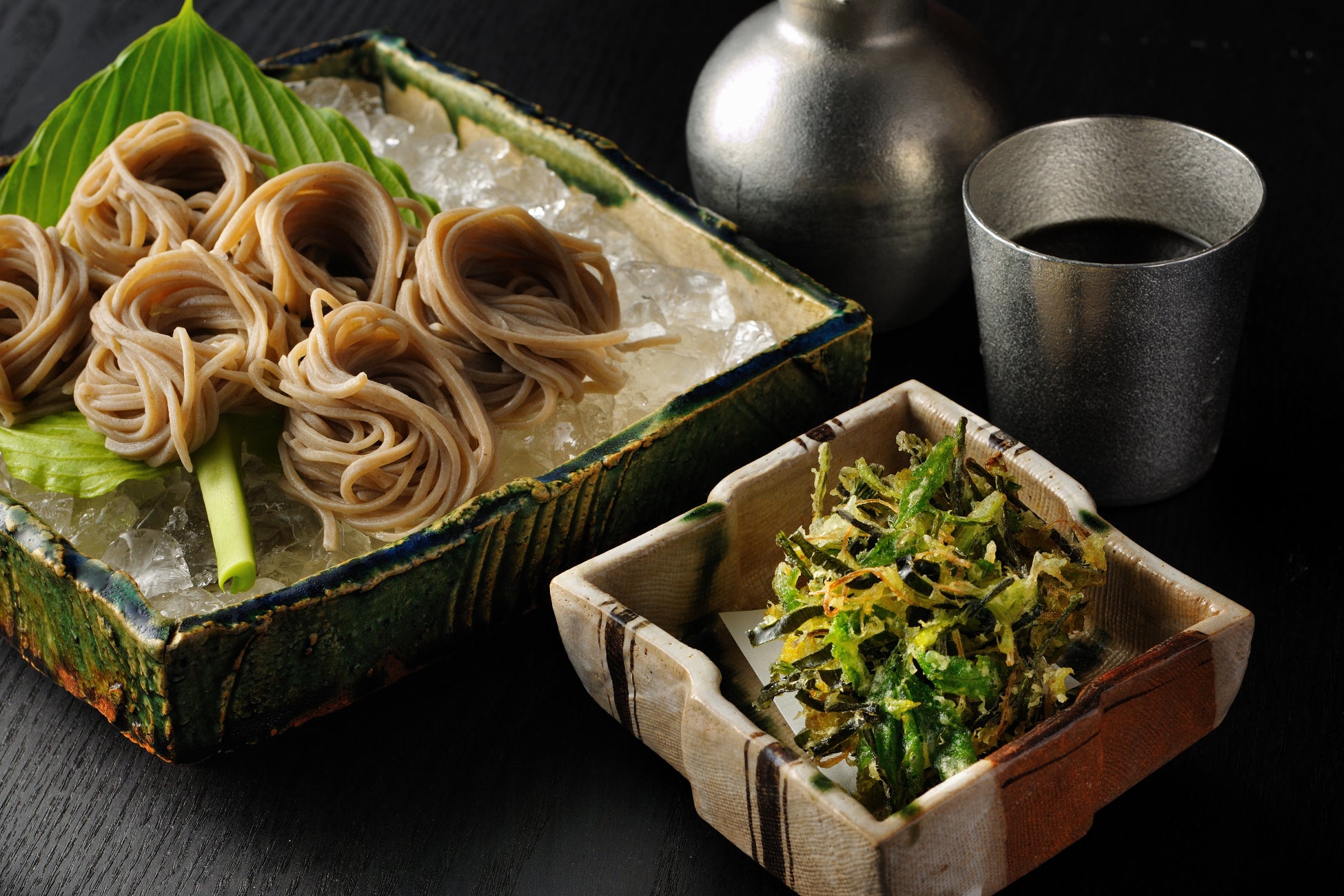 締めの食事では、それまでに使用した山菜の中で余していた部分を全て一つにまとめ、かき揚げにして提供します。食材を余すことなく、美味しく提供したいという料理長の想いから、残った山菜の量と味わいを見極めて、その時々で山菜に合わせる調味料を変更します。ウドのような香りが特徴の食材には香りを引き立てる塩を、苦味が強い食材にはコクと旨味が強いからすみを削り合わせます。食材と調味料の調和が心地よい、その日だけのかき揚げを、締めの蕎麦と共に楽しめます。