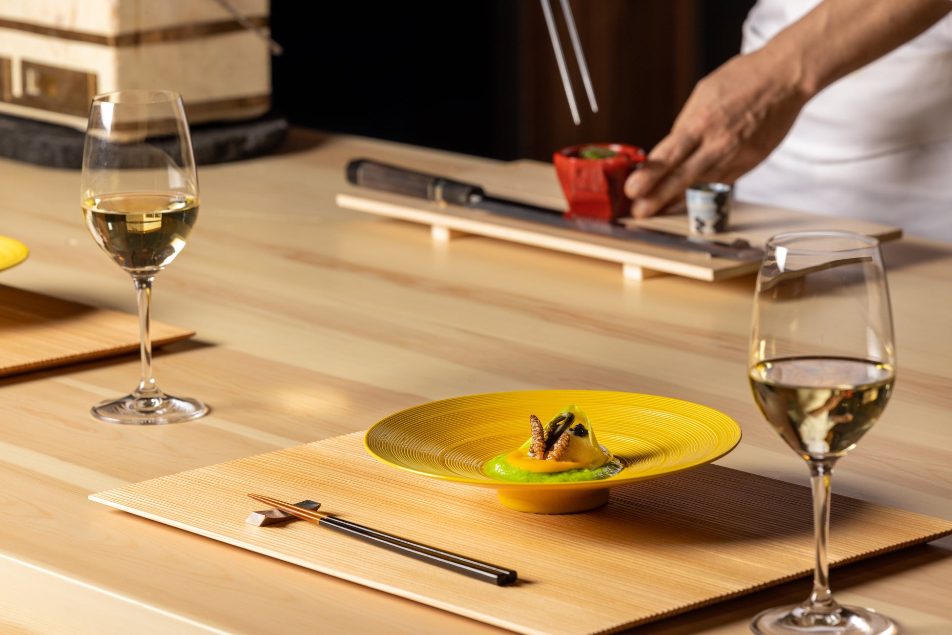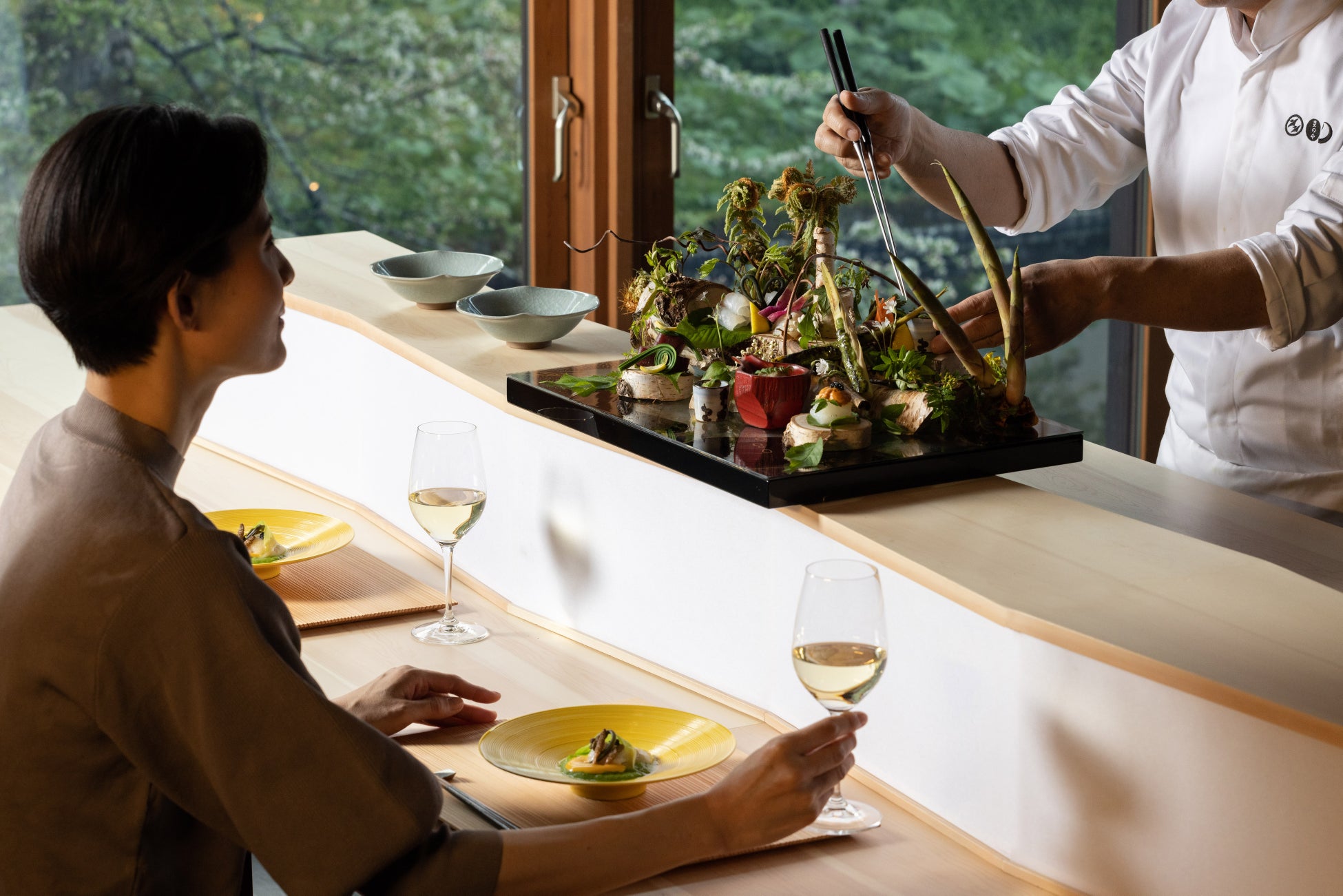 山菜それぞれの味わいを引き立てる、日本酒やワインなどを組み合わせたペアリングを提供します。例えば、先付には、バランスの取れた甘味と酸味が特徴の「Grand Millesime Brut Gosset 2004」を合わせます。アスパラガスの摺り流しと泡檸檬に同調する一杯です。また、向付八寸には、若々しい苦味が山菜と相性が良く、心地よい果実香と穏やかな酸が魚介の旨味を引き立てる「黒澤 生酛純米 新緑」を用意します。