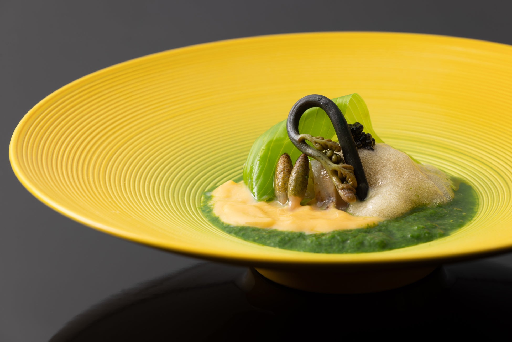 雪の下から山菜が芽を出す、春の始まりの情景を表現した先付です。山菜は、ウルイ、ツクシ、ワラビを使用しています。ツクシやワラビの香りや食感が、アスパラガスの摺り流しの甘味と泡檸檬の爽やかな酸味と合わさり、香ばしく炙った肉厚な帆立の旨味を引き立てます。山菜それぞれの触感や泡檸檬の口溶けが軽やかな一品です。