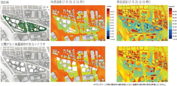 気象条件をもとに大阪の夏季の体感温度と表面温度をシミュレート。夏の日射が厳しい時間帯(15時)で緑陰の効果により体感温度が4~6℃、表面温度が13~16℃程度下がることが確認できました。高木による緑陰は表面温度と体感温度を下げるとともに、夜間には周辺へ涼しい空気がにじみ出すと考えられ、ヒートアイランド現象の抑制にも寄与する都心の貴重なクールスポットになると期待されます。