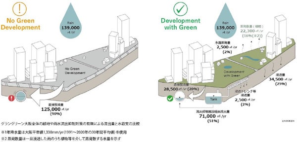雨水の貯留施設や浸透トレンチ、砕石貯留槽などの雨水流出抑制施設の効果や緑の大地の浸透能力を可視化。年降雨量の約半分(約73,500平方メートル/年)を流出抑制施設などにより貯留コントロールするとともに、一部の雨水は植栽の灌水として有効活用されます。雨水の浸透は約34,500平方メートル/年に達し、緑の大地を通した浸透や蒸発散による水循環の健全化にも寄与し、土壌や空気の環境を改善することが示唆されます。
