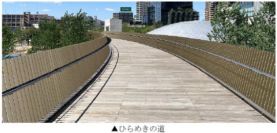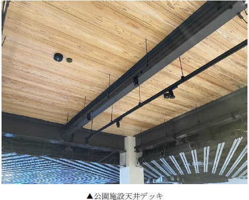 公園施設等一部エリアでは、MEC Industry 株式会社※5の新建材「MIデッキ(型枠材兼仕上げ材)」を採用。RC造・S造で使われる鉄筋トラス付き鋼製デッキと木板を組み合わせた新たな建材で、伐採適齢期を迎えた国産木材を活用することで、国土保全や炭素固定にも貢献します。