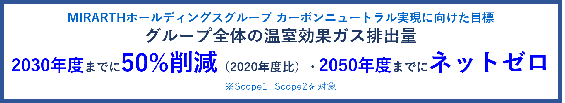 MIRARTHホールディングス株式会社(本社:東京都千代田区/代表取締役:島田和一)は、カーボンニュートラルの実現に向けて、温室効果ガス排出量削減における中長期目標を設定しましたのでお知らせいたします。MIRARTHホールディングスグループは、サステナビリティ基本方針として「住宅の供給や自然エネルギーの導入など、事業を通じたサステナビリティ活動に取り組むことで社会課題の解決とSDGs(持続可能な開発目標)達成に貢献する」ことを掲げ、これまでも再生可能エネルギーを活用したエネルギー事業や環境性能の高い住宅供給を通じた温室効果ガスの削減に取り組んできました。