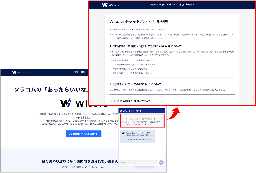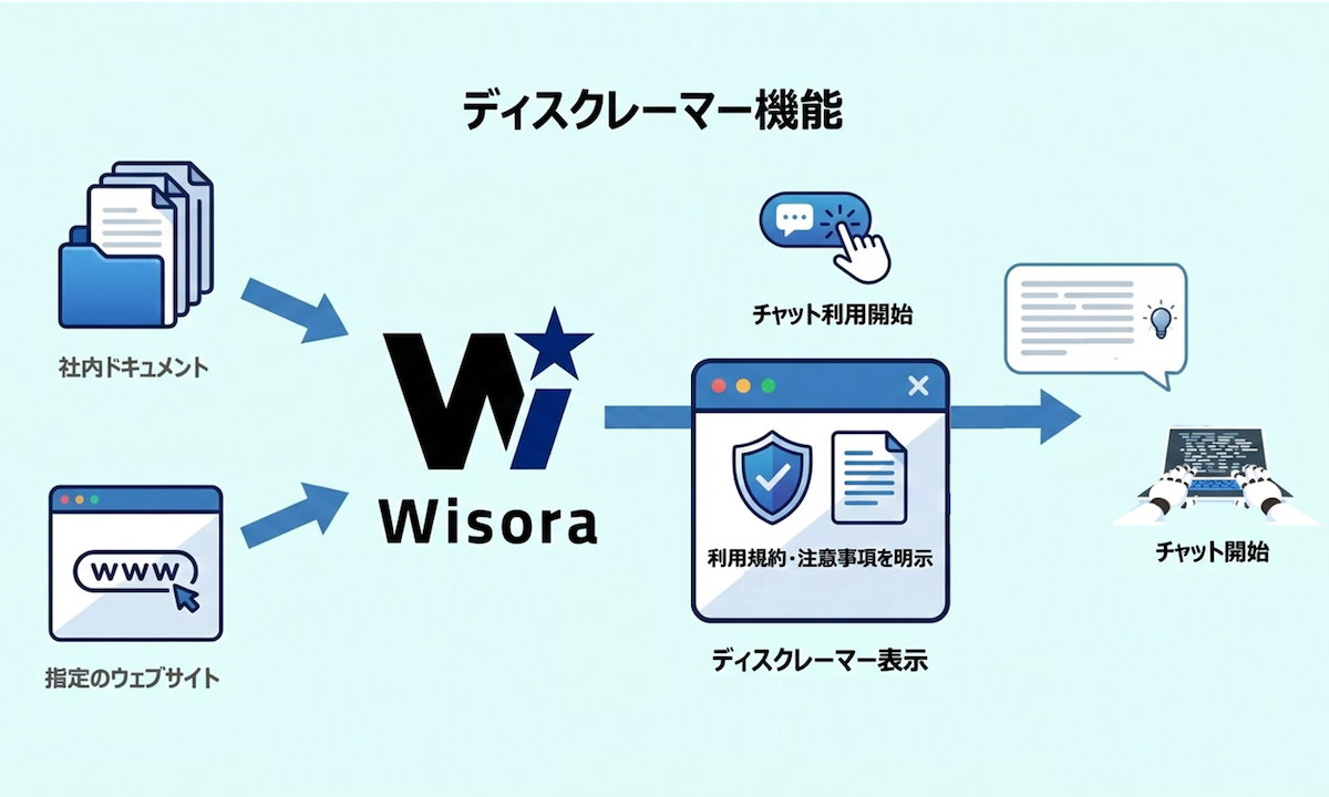Wisoraの利用拡大を受け、Webサイトなどで提供されるAIボットを、利用者が安心して利用できるよう、このたび「ディスクレーマー機能」を提供開始しました。