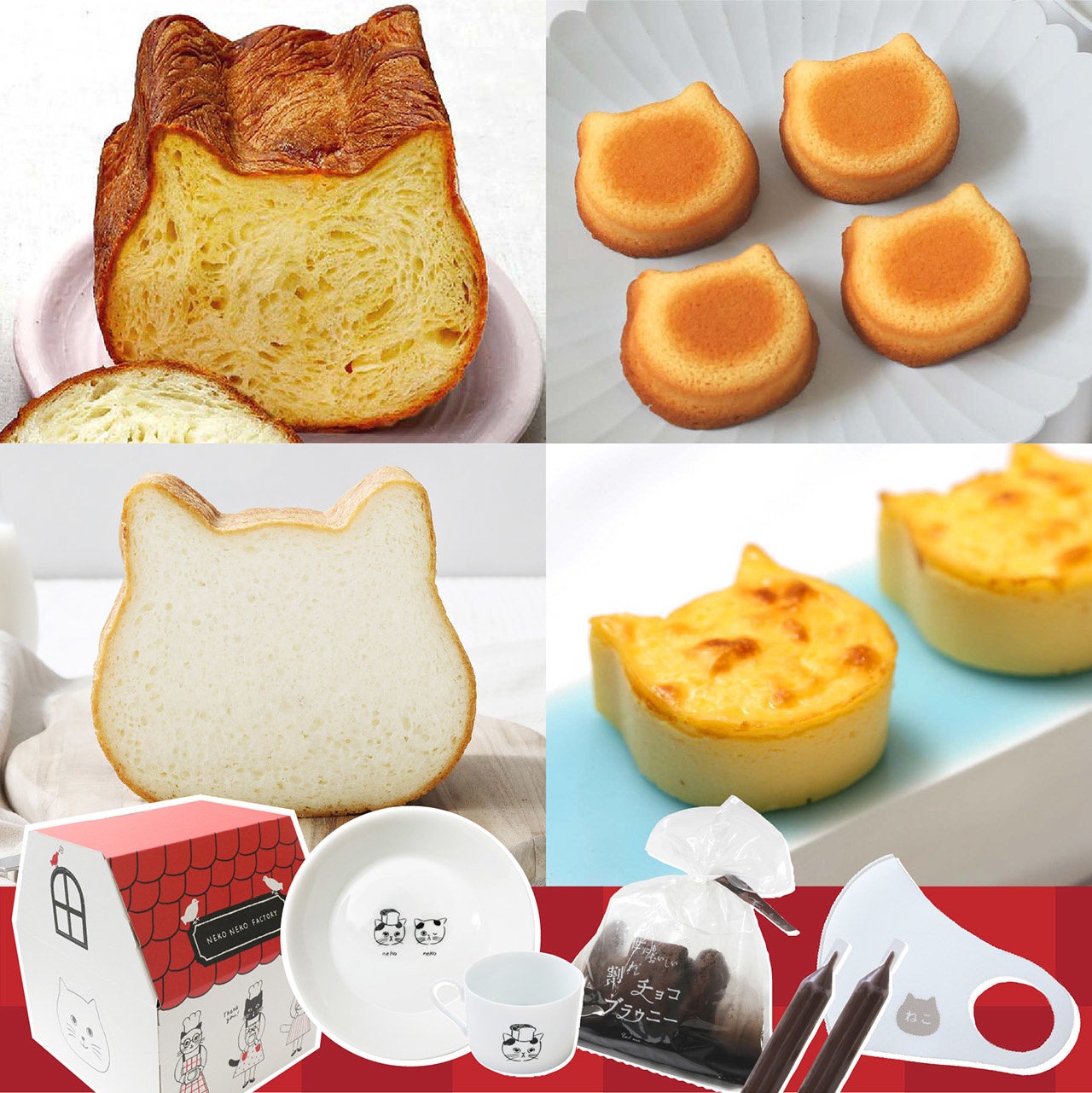 ・内容:京都ねこねこ食パン1個、ねこねこ食パン プレーン1個、にゃんチー1箱、ふぃにゃんシェ1箱、世にもおいしい割れチョコブラウニー1袋、チョコペン2本、ねこねこのコーヒーカップ1個、ねこねこのボウル(15cm)1枚、ねこねこマスク1枚