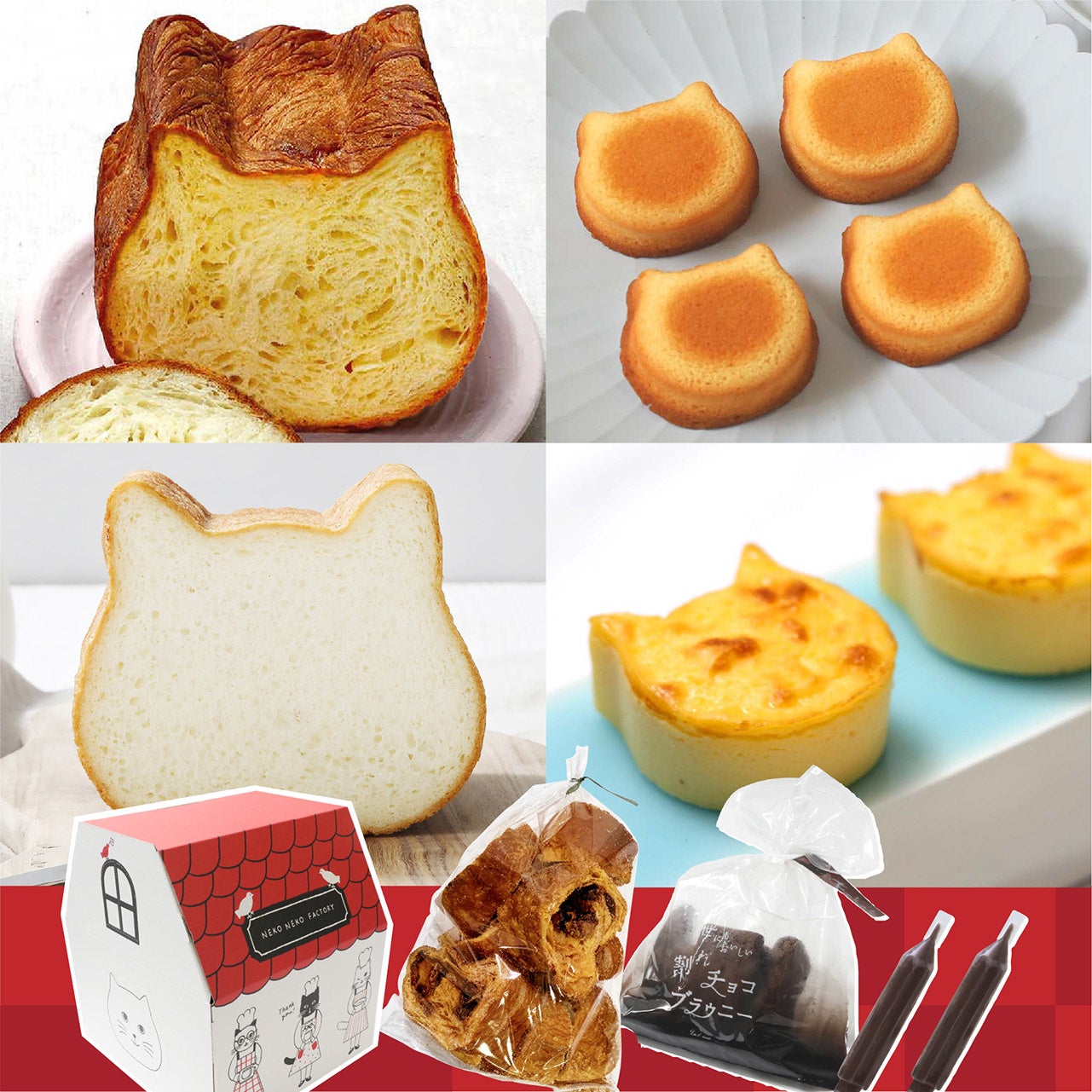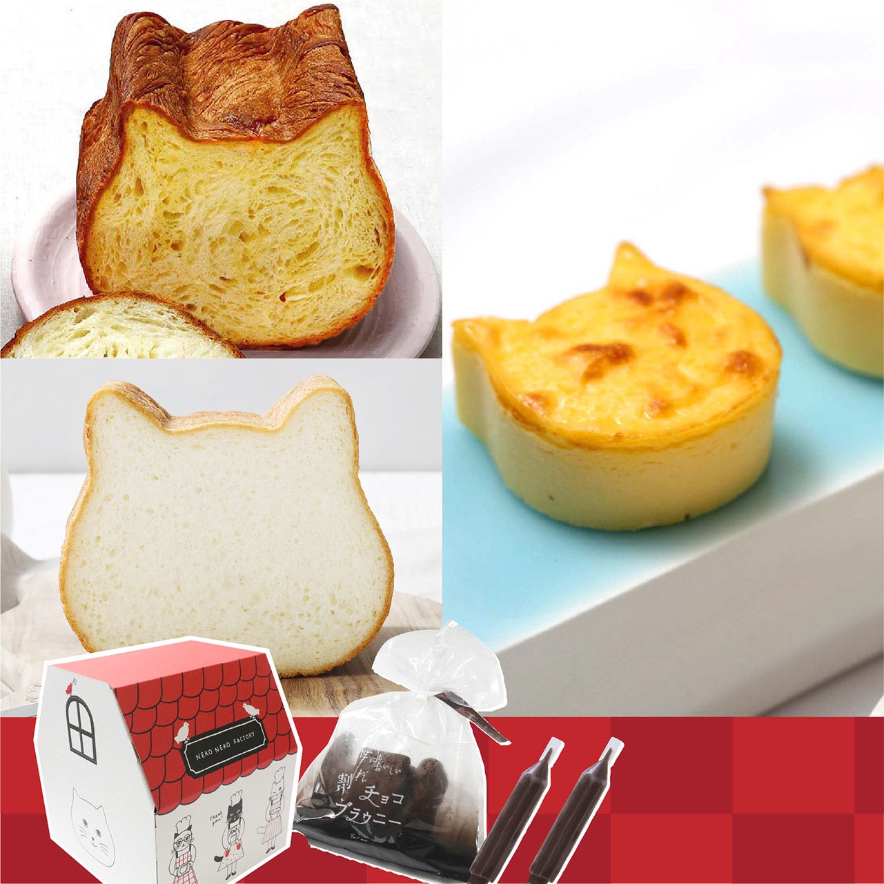 ・内容:京都ねこねこ食パン1個、ねこねこ食パン プレーン1個、にゃんチー1箱、世にもおいしい割れチョコブラウニー1袋、チョコペン2本