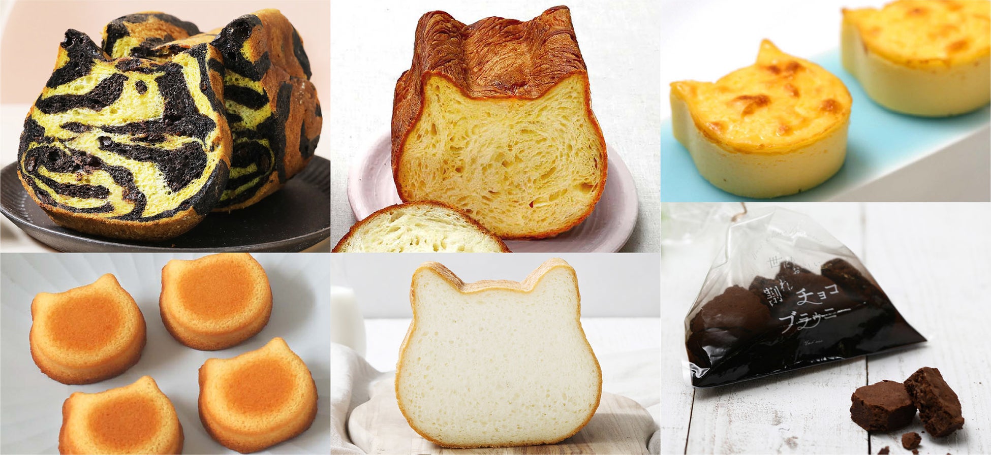 ねこねこ食パン定番ラインナップ(プレーン、チョコ、こしあん、三毛猫など)の他、ねこねこフレンチトーストや期間限定フレーバー等ございます。※猫の殺処分ゼロを目指して「ねこねこ食パン」売上1本につき1円を当社より動物愛護センターに寄付いたします。