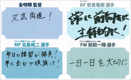 アビスパ福岡の監督と3名の選手から、アカデミー生に向けて力強いエールが込められた直筆の応援メッセージをいただきました。