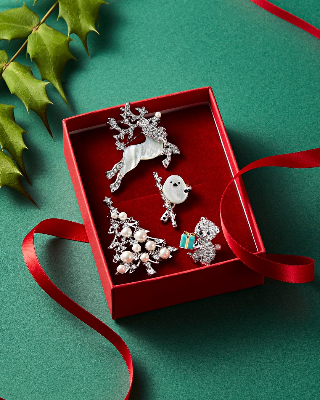ホリデー気分を盛り上げるモチーフアクセサリー。ひとつ身に着けるだけで華やぐブローチは、大切な方への贈りものとしておすすめです。