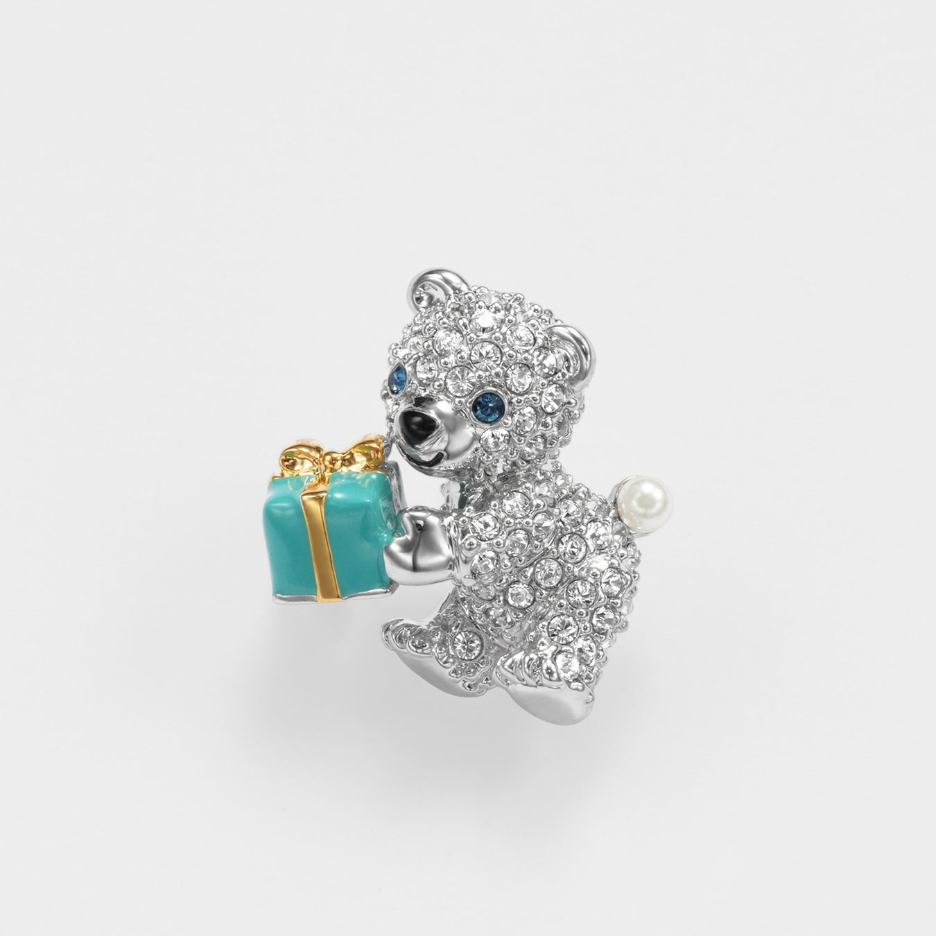 ミントブルーのギフトボックスを抱えたベアのブローチ。